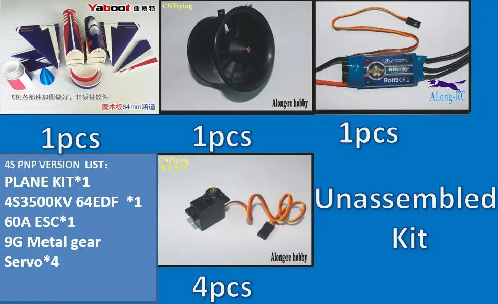 4S список версий PNP: Комплект самолета * 1 4S3500KV 64EDF * 1 60A ESC * 1 Металлический сервопривод 9G * 4
