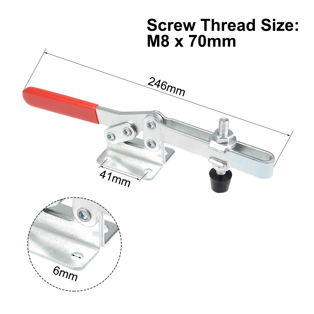 Модель: DEMA-203FL Угол открывания бар: 90 ° Угол открывания ручки: 60 ° Удерживающая Емкость: 227 кг/499,4 фунта Отделка: оцинкованная Материал: углеродистая сталь, пластик Размер монтажного отверстия: Φ6 мм Расстояние Монтажного отверстия: 41 мм x 28 мм (Д * Ш) Размер винта: M8 x 70 мм Размер зажима: 246x47x55 мм (Д * Ш * В)