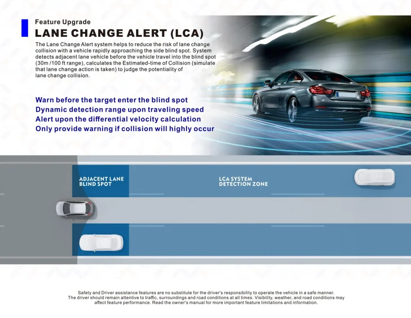Комплект для обнаружения слепого пятна (BSD) предназначен для уменьшения риска бокового заднего слепого пятна. Комплект BSD помогает водителю в смене полосы движения, когда драйвер не может легко следить за боковой задней слепой точкой прилегающей полосы. Система обнаруживает приближение транспортного средства-мишени в глухом месте и предостерегает через визуальный и звуковой сигнал для достижения предотвращения столкновения. Набор для обнаружения слепых пятен является только помощью водителя и не должен использоваться в качестве заменителей безопасных методов вождения.