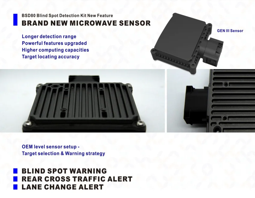 Комплект обнаружения слепого пятна 3-го поколения с мощным обновлением является большим преимуществом для любого водителя. Система дает вам Звуковое и визуальное предупреждение не менять полосы движения: Нет выхода из радара-обнаружите каждый автомобиль в глухом месте Система LCA-Динамический диапазон при скорости differential Система RCTA-помогает водителю безопасно выезжать из любой парковки Режим gps-получение данных скорости для активации Светодиодный индикатор-укажите рабочий статус и оповещение