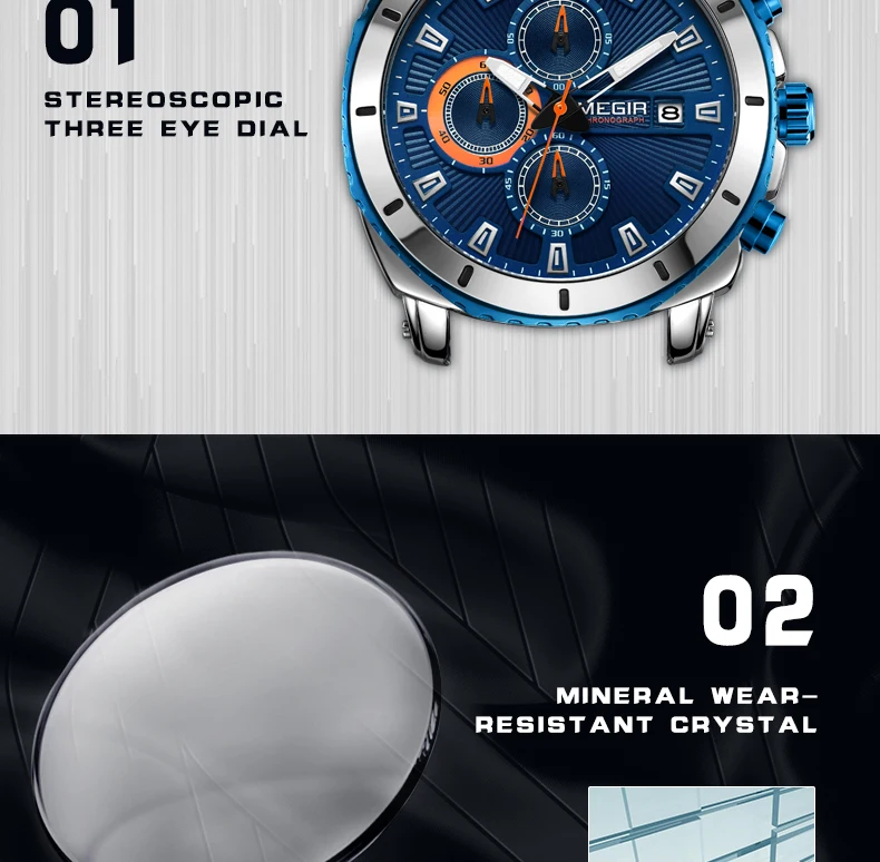 Особенности: -Оригинальные часы MEGIR из официального магазина MEGIR; -100% новый с биркой и гарантией качества; -Водонепроницаемость 3 АТМ (вы можете использовать его во время дождя и мытья рук, не поддерживает горячую воду и плавание); -С хронографом (секундомером) и функцией подсветки -MEGIR Креативный дизайн и высококачественные материалы. Технические характеристики: -Бренд: MEGIR -Модель: 2075 -Товар: мужские часы -Тип часов: кварцевые часы/деловые часы/Relogio Masculino/Zegarek Meski/Erkek Kol Saati -Функция: хронограф, секундомер, светящийся, Автоматическая Дата -Материал корпуса: сплав -Материал ремешка: сплав Параметры: -Диаметр корпуса: около 48 мм -Толщина корпуса: около 13 мм -Длина ремешка (максимальная носимая длина): около 220 мм -Ширина ремешка: около 22 мм