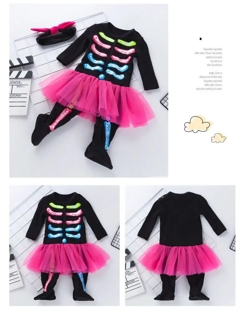 Название: детский комбинезончик Цвет: как на картинке Ткань: 95% хлопок Пол: для маленьких девочек Сезон: лето/весна/осень Посылка включает в себя: Детский комбинезон, костюм (комбинезон + повязка на голову) Возраст костюма: 0-18 месяцев Упаковка: пенополиуретан с открытыми порами Особенности: -- Одежда для вечеринки Хэллоуин -Милый и модный стиль