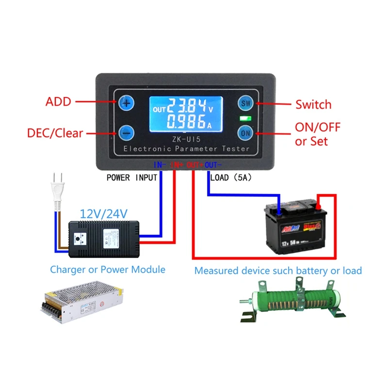 1, ЖК-дисплей: в обычном режиме ЖК-дисплей отображает входное напряжение и рабочую температуру на обратной стороне; нисходящий канал показывает ток в реальном времени, мощность, емкость и время разряда. в защищенном режиме ЖК-дисплей отображает код защиты. В режиме настройки ЖК-дисплей отображает различные коды параметров и пороги параметров.