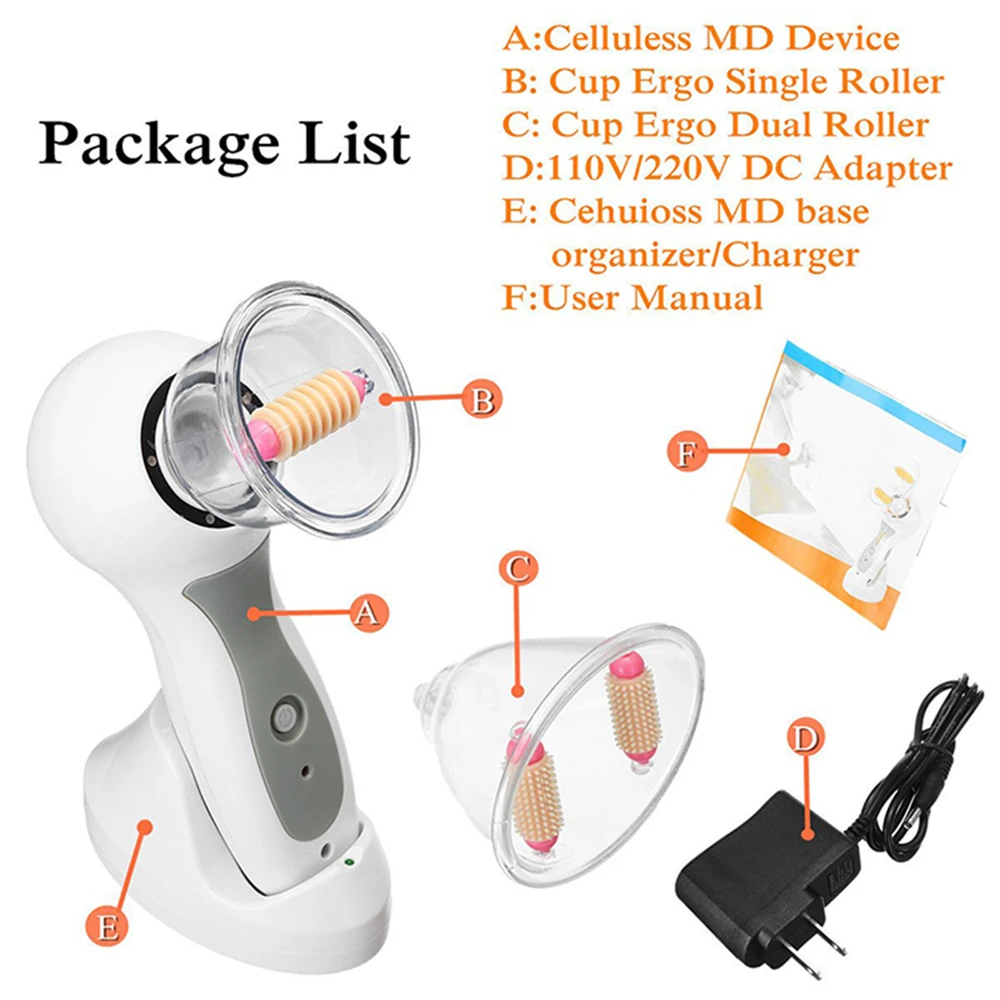 Особенности: Портативный и простой в использовании. Делая вашу кожу плотной, твердой и молодой. Идеально подходит для рук, живота, спины, бедер, ягодиц, ног. Сменные чашки с роликами. Переменная всасывания для глубокий массаж. Тонизирует мышцы и снимает напряжение. Описание: Она будет заметно гладить кожу. Скользит, разглаживает и выравнивает тело. Оставляет кожу сияющей, ровной кожей лица. Не имеет боковых эффектов, таких как хирургическое лечение и инъекции. Помогает улучшить и укрепляет кожу. Технические характеристики: Адаптер переменного тока: штепсельная вилка ЕС/штепсельная вилка США Вход: 100-240 В переменного тока, 50/60 Гц Выход: 5 В, 500 мА Цвет: белый и серый Посылка включает в себя: 1 X MD Ergo устройство 1 X Двойной Ролик чашки Ergo 1 X чашка Ergo одиночный ролик 1 х адаптер переменного тока (штепсельная Вилка европейского стандарта) 1 X базовое зарядное устройство MD