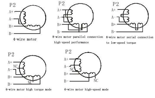 В FMD2740C водитель может управлять всеми ток 4A 4-проводной, 6 проводов или 8-жильный 2-фазный/4-фазами, приводятся ниже 4-проводной, 6 проводов, 8 проводов шагового двигателя подключение: