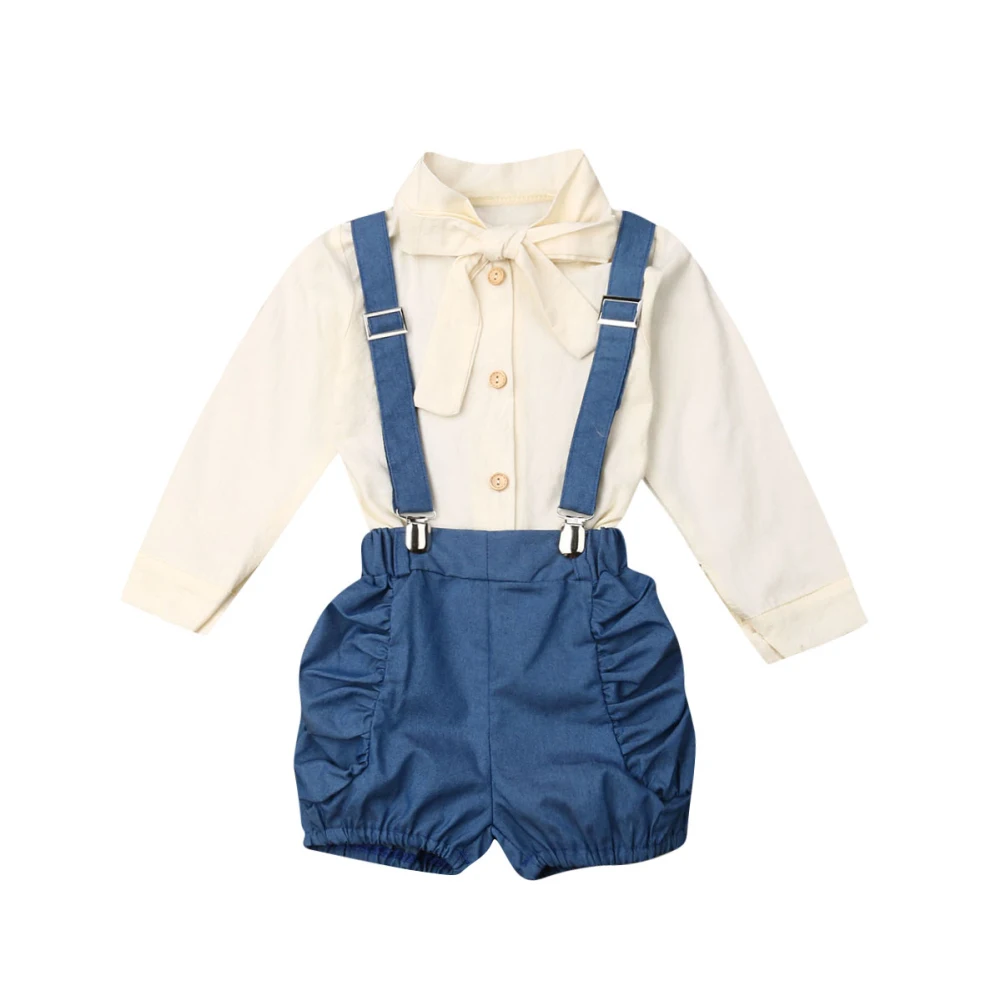 Новые осенние детские костюмы с бабочкой для маленьких девочек, блузка, рубашка Топ + шорты на лямках штаны на подтяжках!