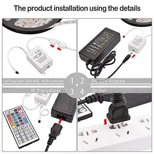 - EASY INSTALLATION -- Easy to install, plug and play without wiring, 5M self-adhesive back tape can be fit on any clean, dry and flat surface. This RGB light strip is cuttable and linkable, we can cut it every 3 LEDs along the cutting marks and then link two sections by connectors