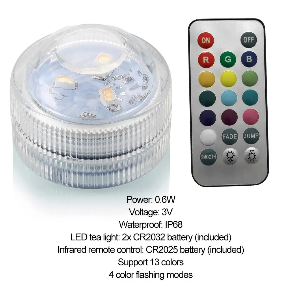 3. Водонепроницаемые Погружные Огни: яркие светодиоды, которые могут быть погружены в воду, идеально подходят для освещения вазы, чаши или любые заполненные контейнеры воды! Эти Водонепроницаемые огни RGB могут превратить расточную чашу в красивый и захватывающий центр, часто используются для мероприятий, лучший выбор для вечерние мероприятия или украшения дома!