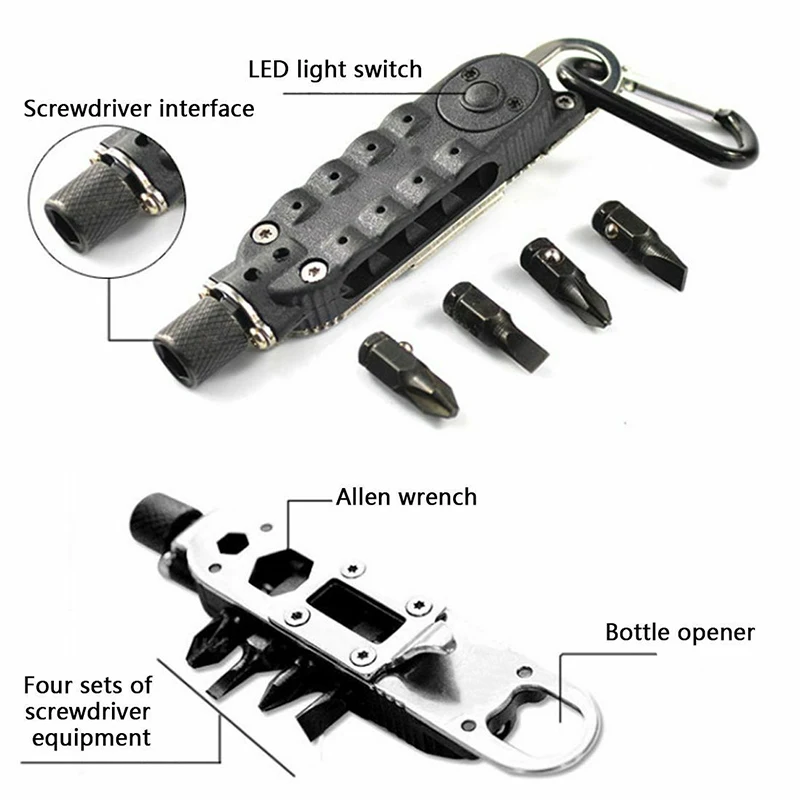 Карманная отвертка-брелок на ключи включает в себя все виды инструментов, есть отвертка, плоские и phillips, Шестигранник, гаечный ключ, открывалка для бутылок, светодиодный фонарик с карабином для переноски.