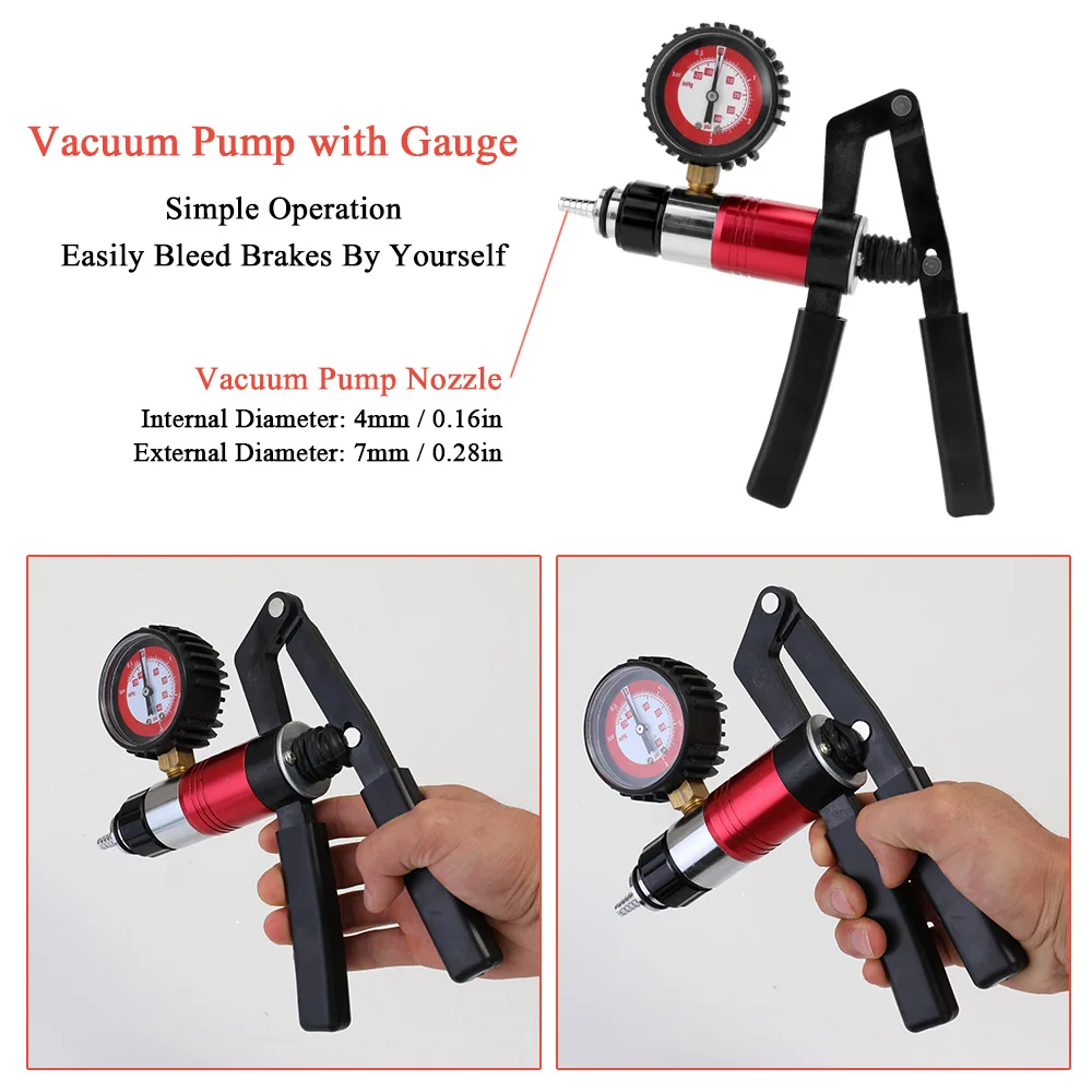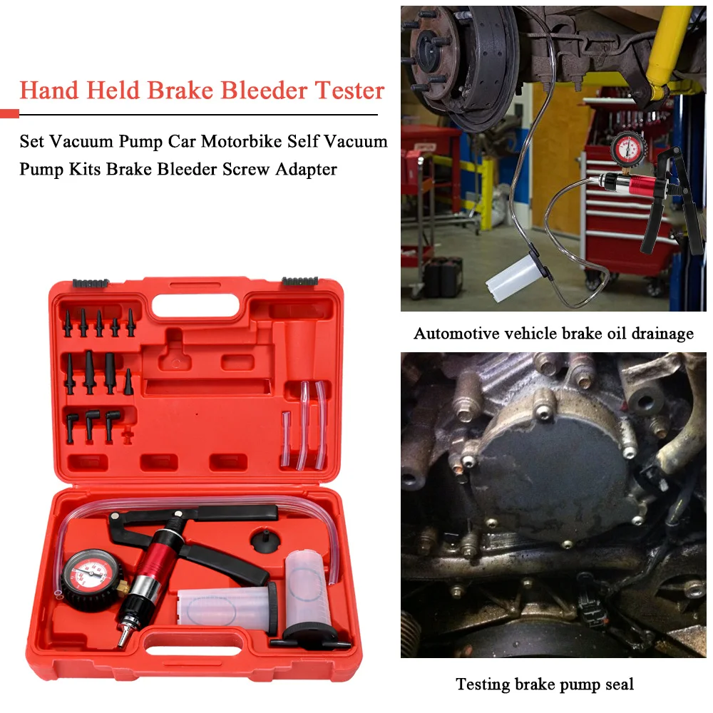 Этот ручной тестер тормозов и муфт bleeder Набор вакуумных насосов для автомобиля, мотоцикла и т. д. легко тормозит и тестирует автомобильные вакуумные системы самостоятельно. Работает на всех автомобилях и моделях. Комплексный набор вакуумных насосов для цеха включает резервуар и адаптер для ниппеля для торможения и кровотечения топливной линии. Ручной насос вытягивает жидкость через сосок, устраняя необходимость использования тормозного рычага или педали. Ручной насос с манометром позволяет тестировать многие вакуумные системы, например: топливные насосы, карбы и т. Д.