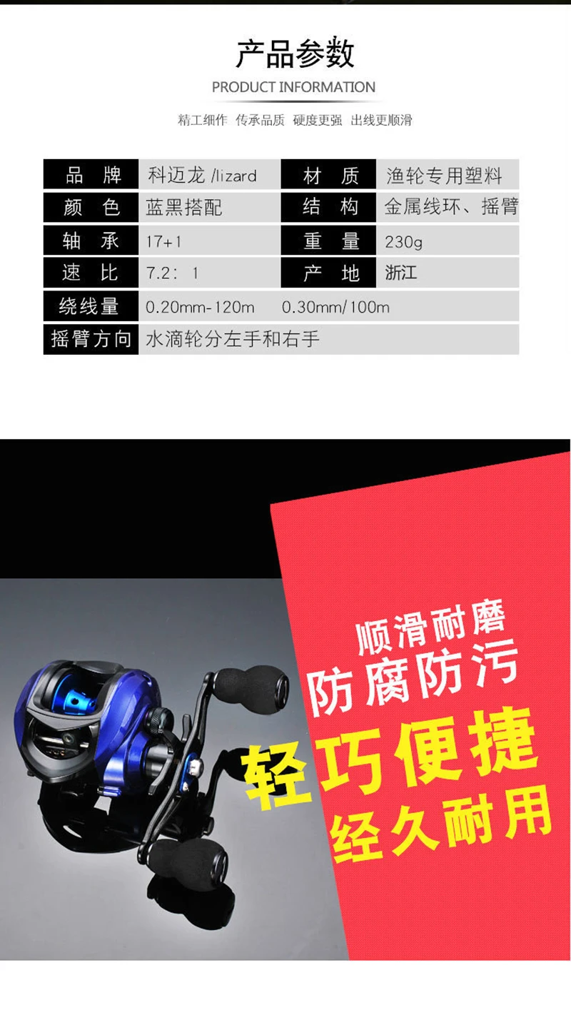 Seiko производство, наследует качество, более прочную твердость, более гладкий выпуск Бренд: броши в виде ящерицы Цвет: черный и синий Подшипник: 17 + 1 Скорость передаточное число: 7,2: 1 Материал: катушка baiitcast (рыболовная Катушка), Специальный пластик Структура: Проволочная чашка, рокер Вес: 230 г Сделано в Китае Вместимость: 0,230 мм-180 м/0,280 мм-150 м/0,300 мм-110 м Направление рокера: катушка для приманки (рыболовная Катушка), разделенная на левые и правые колеса Характеристики продукта: гладкая и износостойкая, антикоррозионная и противообрастающая, легкая работа, долговечная
