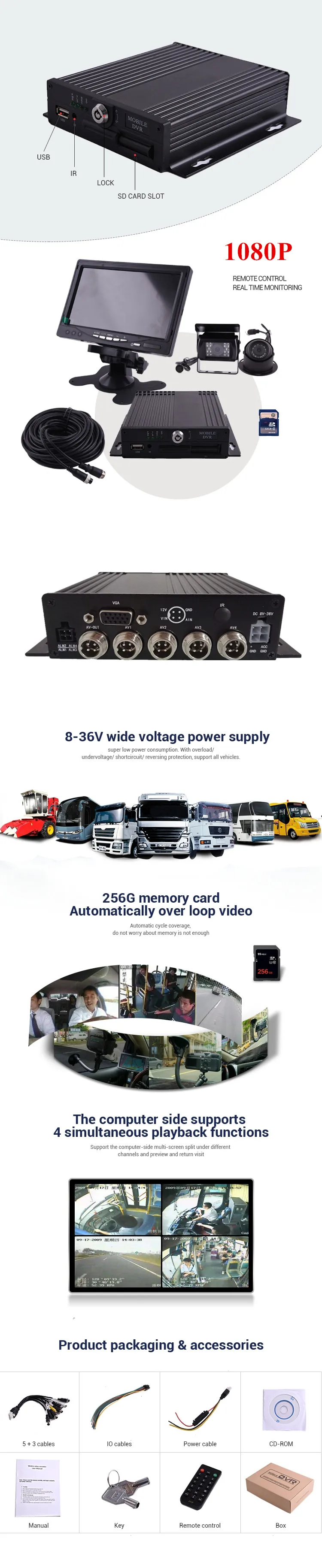 Особенности HiSilicon видео решение, H.264 режим сжатия, многопотоковая запись, обеспечивая 1080 P миллионов HD видео эффектов. Поддержка 4 каналов в реальном времени 1080 P миллионов AHD HD ВХОД/4 канала аналогового SD камеры вход/2 канала HD + 2 канала стандартного разрешения смешанного входа; Запись HD в реальном времени, видео 1080 P/720 P/D1/HD1/CIF опционально, качество кадра регулируется; Профессиональная конструкция электропитания транспортного средства, 8-36 В постоянного тока с широким входом напряжения; Перегрузка/напряжение/короткое замыкание/обратное соединение и другие схемы защиты, подходят для всех видов транспортных средств; Provides обеспечивает выходную мощность 12В/2А для постоянного напряжения питания нескольких интерфейсных устройств, таких как камеры и небольшие экраны; SD карта записывает данные (до одной карты 256 г), может полностью сопротивляться повреждению данных, вызванному вибрационной пылью на автомобиле, таким образом, продукт может адаптироваться к плохим дорожным условиям, которые большинство продуктов не могут адаптироваться; Патологическая защита функции перезапуска часов, лучшая защита машин и видео; Эксклюзивная технология предварительной передачи файлов для транспортных средств для решения проблемы фрагментации данных, вызванной повторным стиранием и написанием, для обеспечения целостности данных; Функция записи времени огнестойкости (время можно настроить до 24 часов); Автоматическая запись, ручная запись, запись по тревоге и другие методы записи для удовлетворения различных потребностей; Отображение информации о транспортном средстве, таких как состояние вождения транспортного средства, номерной знак, трасса и т. д., удобно для управления; 4-полосная тревожный вход (переключатель двери, свет, система охлаждения двигателя движения задним ходом, различные типы настраивается), может быть связан с несколькими вариантами ответов; Очень надежный воздушный головной видеовход и выходной интерфейс, легко установить и удалить, и более сейсмическая производительность; Управление интерфейсом системы является гладким, интуитивно понятным и совершенным; Upgrade обновление программного обеспечения с помощью sd-карты или USB флэш-накопителя; Пакетная Функция настройки в соответствии с требованиями заказчика; Dimension Размер: 145 мм * 95 мм * 45 мм Weight Вес: 0,75 кг;