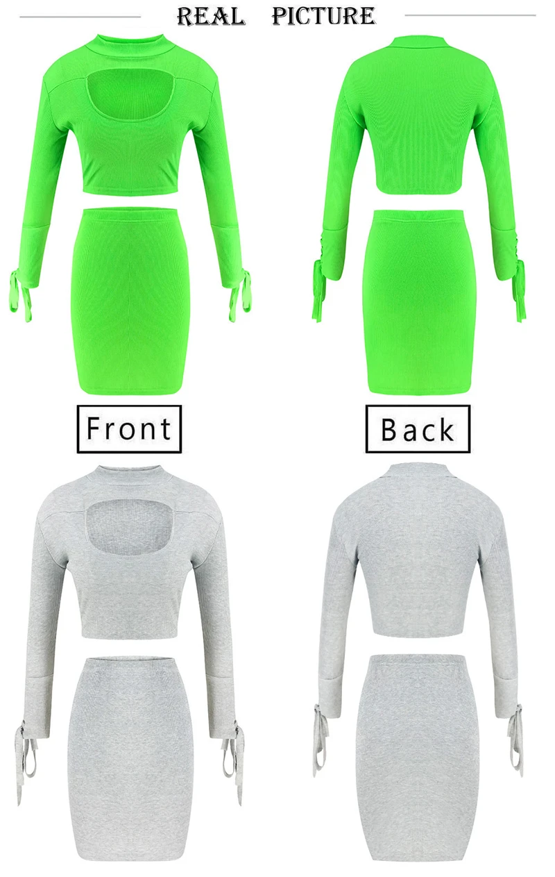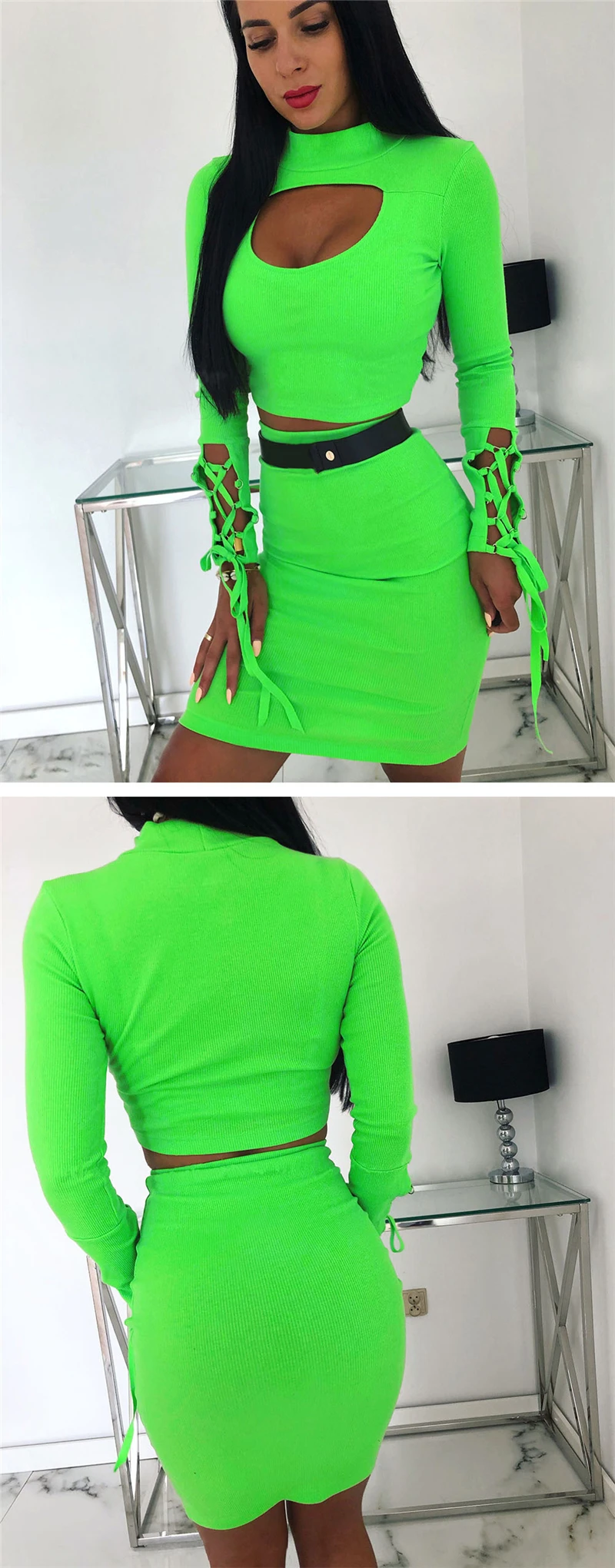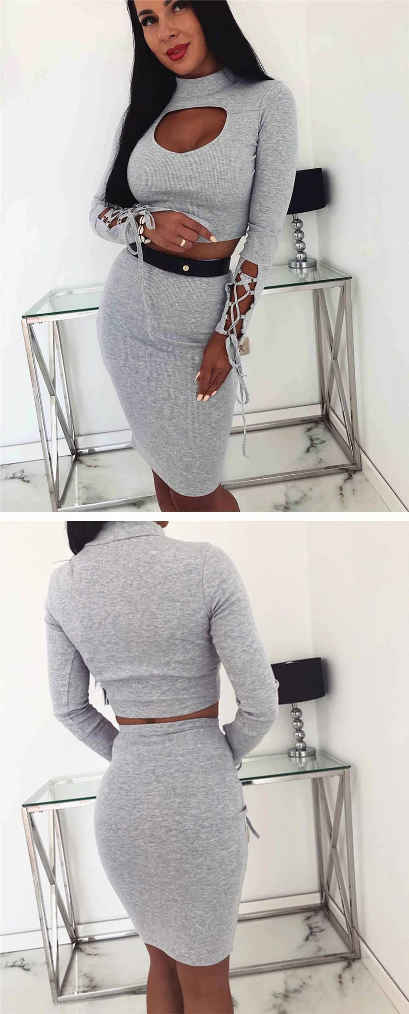 Женский Повседневный трикотажный комплект из двух предметов Adogirl, однотонное облегающее платье с высоким воротом и длинными рукавами на шнуровке, осень 2019