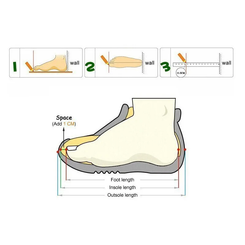 3: длина стопы + 1 см = Внутренняя длина. Например, Измерьте длину стопы вашего ребенка следующим образом. Если длина стопы 11 см и вы можете добавить 1 см. Другими словами, выберите внутреннюю длину 12 см. Спасибо за поддержку.