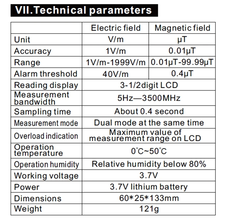 Материал: АБС-пластик Единица измерения: V/m (электрическое поле); Μt (магнитное поле) Точность: электрическая: 1 в/м; Магнитная: 0.01μT Диапазон: электрический: 1-1999/м; Магнитные: 0,01-99.99μT Порог тревоги: электрический: 40 В/м; Магнитный: 0.4t t Дисплей: 3-1/2 ЖК-дисплей Полоса пропускания: 5 Гц-3500 МГц Время выборки: прибл. 0,4 секунды Режим тестирования: Синхронный тест Bimodule Индикация перегрузки: максимальное значение диапазона измерения на ЖК-дисплее Рабочая температура: 0 °C-50 °C Рабочая влажность: относительная влажность <80% Рабочая Напряжение: 3,7 V Питание: 3,7 V 600mAh литиевая батарея Размер изделия: прибл. 133*60*25 мм/5,24*2,36 * 0.99in Вес изделия: прибл. 121 г/4,27 унций Размер посылка: прибл. 17,5*12*5,3 см/6,89*4,73 * 2.09in Вес посылка: прибл. 243 г/8,57 унций
