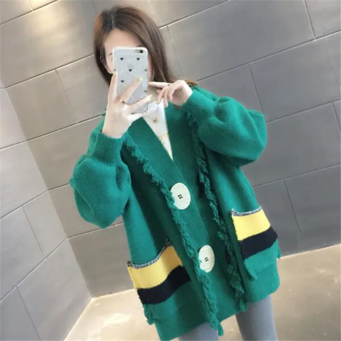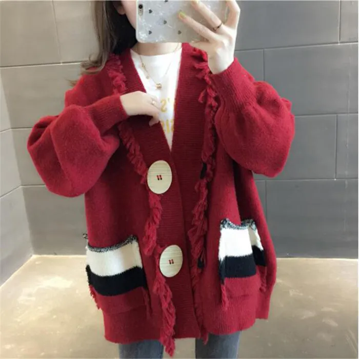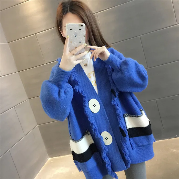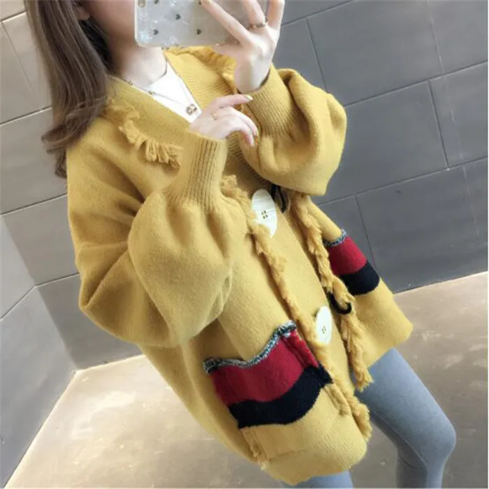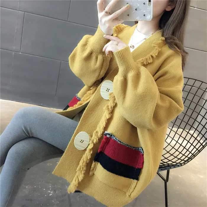 Женский свитер пальто 2019 Весна Новая мода повседневное вязаное пальто осень женский свободный v-образный вырез фонарь рукав вязаный кардиган TTT217