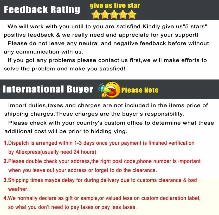 Как связаться с нами? 1. Вы можете связаться с нами, оставьте нам сообщение на AliExpress или напишите нам 2. Наше рабочее расписание: Соединенные Штаты: 6:00 ~ AM 2:00 Франция: AM 2:00 ~ AM: 10: 00 Великобритания: 1:00 ~ 9:00 Испания: AM 2:00 ~ AM: 10: 00 Германия: AM 2:00 ~ AM: 10: 00 AU: AM 12:00 ~ PM: 8: 00 Бразилия: 10:00 ~ AM 7:00 Россия: 5:00 ~ PM: 2:00 3. Мы можем ответить на письма в течение 24 часов, в течение 36 часов в выходные.