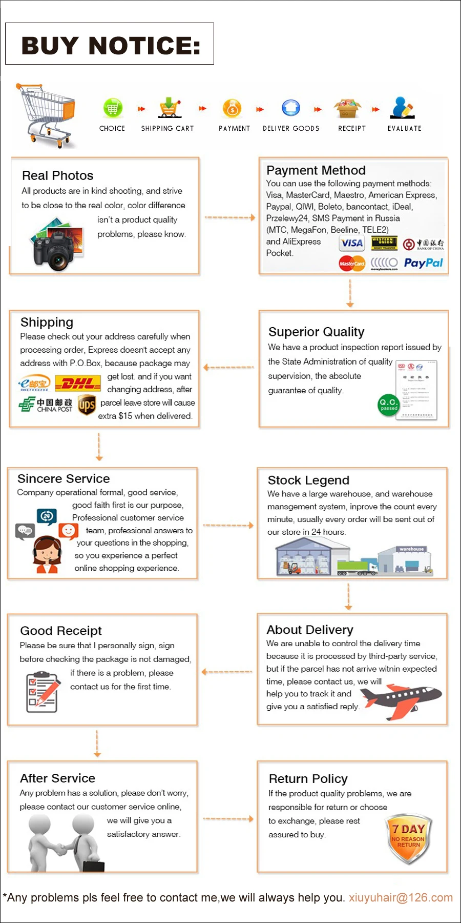 1. Обычно мы отправляем товары в течение 5 дней с помощью быстрых и надежных способов доставки. 2. Мы постараемся сделать все возможное, чтобы объявить его как «подарок» с более низкой стоимостью, но мы не несем ответственности, если есть какие-либо тарифы. 3. Ваш счастливый опыт покупок и пять звезд отзывы очень важны для нас. Пожалуйста, не стесняйтесь связаться с нами, если у вас есть какие-либо вопросы, мы постараемся сделать все возможное, чтобы решить проблемы для вас.