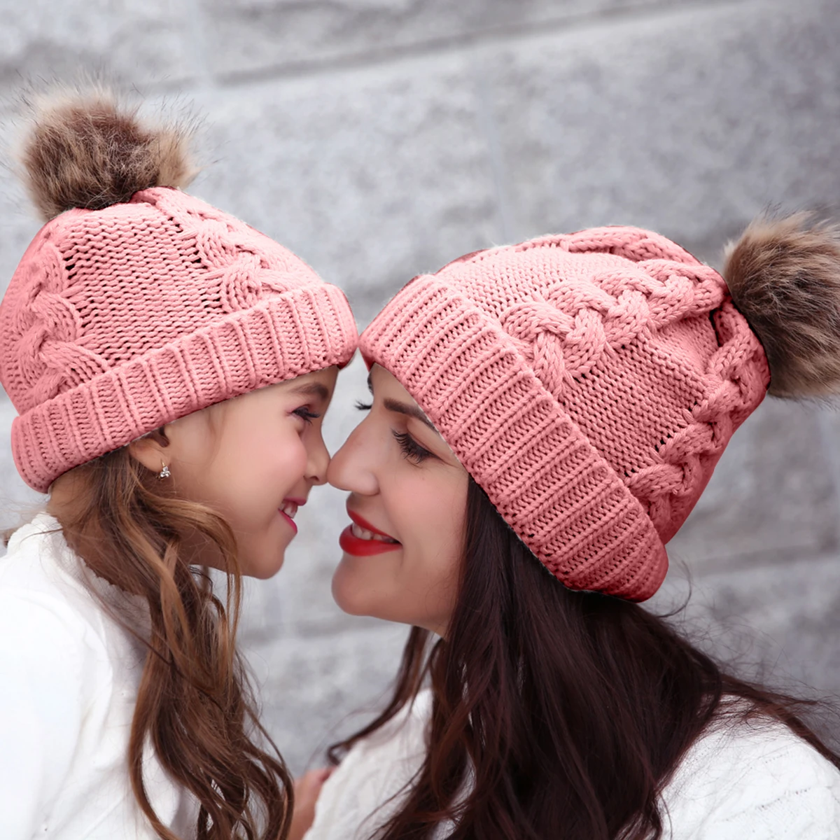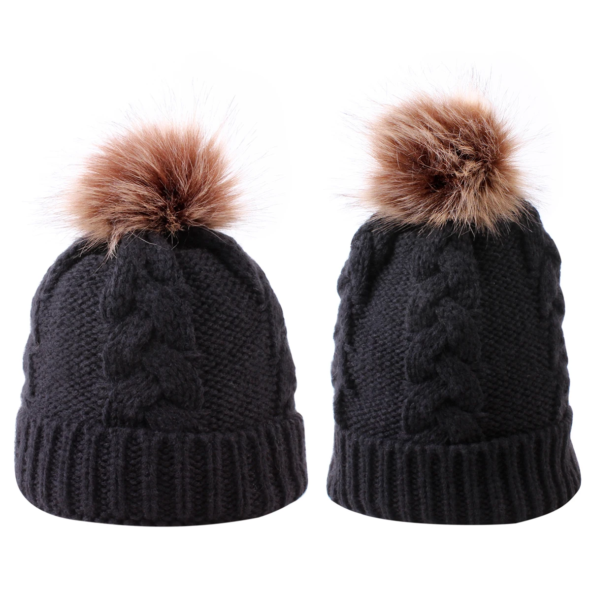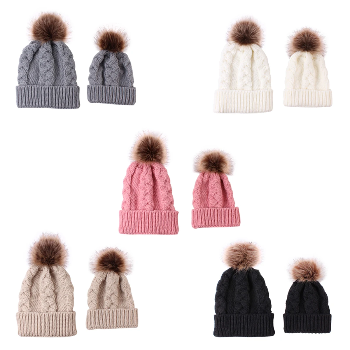 2 шт. милые родитель-Детские шапочки, милая детская зимняя шапка с помпоном, шапка с меховым помпоном для мамы, детей, теплая вязаная шапка, шапка для новорожденного
