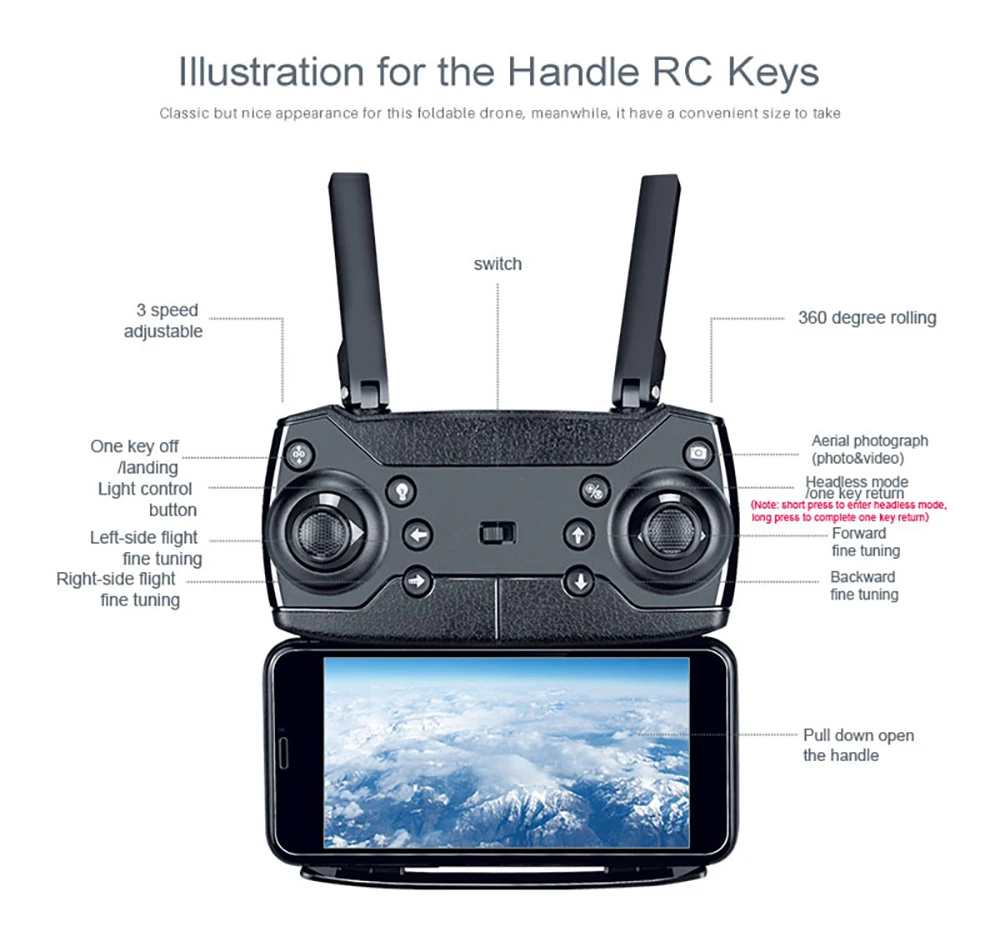 Стандартная функция: складной корпус, вверх/вниз, двигаться вперед, назад, повернуть налево, повернуть направо, в сторону налево, в сторону направо, вращение на 360 градусов, Безголовый режим, возврат одной кнопкой, высота удерживания, один ключ Взлет/посадка.