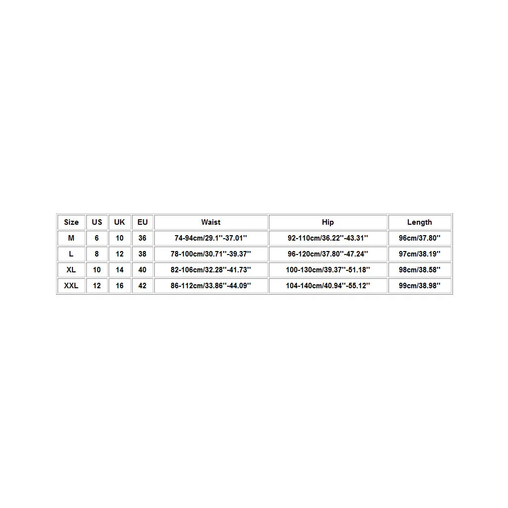 Таблица размеров:Размер США Великобритания ЕС Талия Бедра Длина М 6 10 36 74-94 см/29,1 ''-37,01'' 92-110 см/36,22 ''-43,31'' 96 см/37,80'' L 8 12 38 78-100 см/30,71 ''-39,37'' 96-120 см/37,80 ''-47,24'' 97 см/38,19'' XL 10 14 40 82-106 см/32,28 ''-41,73'' 100-130 см/39,37 ''-51,18'' 98 см/38,58'' XXL 12 16 42 86-112 см/33,86 ''-44,09'' 104-140 см/40,94 ''-55,12'' 99 см/38,98'' Размер: M США: 6 Великобритания: 10 ЕС: 36 Талия: 74-94 см/29,1 ''-37,01'' Обхват бедер: 92-110 см/36,22-43,31 дюйма Длина: 96 см/37,80'' Размер: L США: 8 Великобритания: 12 ЕС: 38 Талия: 78-100 см/30,71 ''-39,37'' Бедра: 96-120 см/37,80 ''-47,24'' Длина: 97 см/38,19 дюйма Размер: XL США: 10 Великобритания: 14 ЕС: 40 Талия: 82-106 см/32,28 ''-41,73'' Обхват бедер: 100-130 см/39,37 ''-51,18'' Длина: 98 см/38,58'' Размер: XXL США: 12 Великобритания: 16 ЕС: 42 Талия: 86-112 см/33,86 ''-44,09'' Обхват бедер: 104-140 см/40,94-55,12 дюйма Длина: 99 см/38,98''