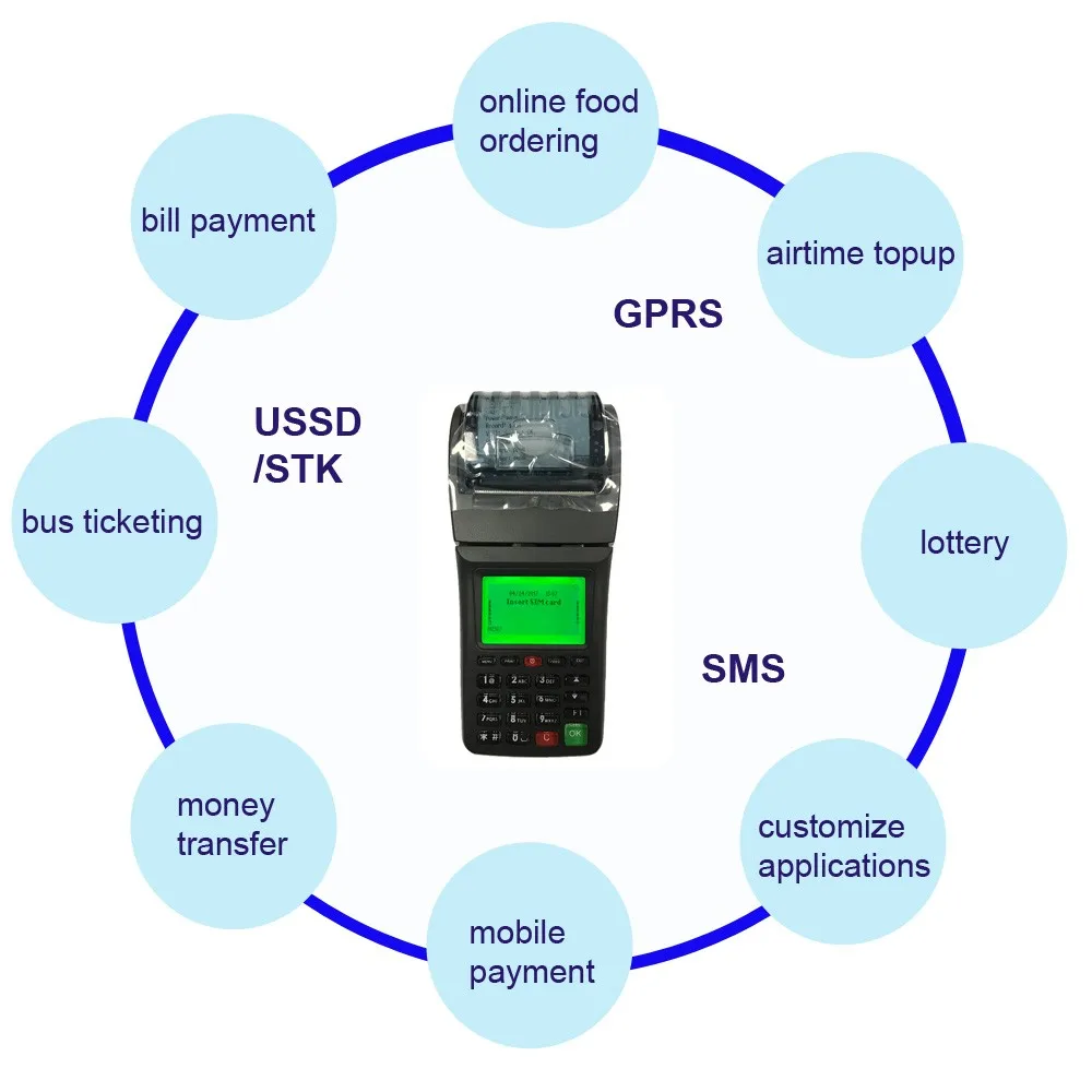 POS машина совместима с 3g, GPRS, SMS, USSD и STK.