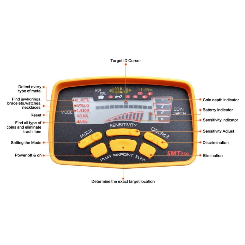 3. Глубина монет-глубина монет расширена до четырех (4) индикаторов глубины, включая «2», «4», «6» и «8 + inches.4. Чувствительность-MD-6250 имеет восемь (8) настроек чувствительности для более точной глубины и определения цели 5. Индикатор состояния батареи-ЖК-дисплей непрерывно освещается для указания уровня заряда батареи.