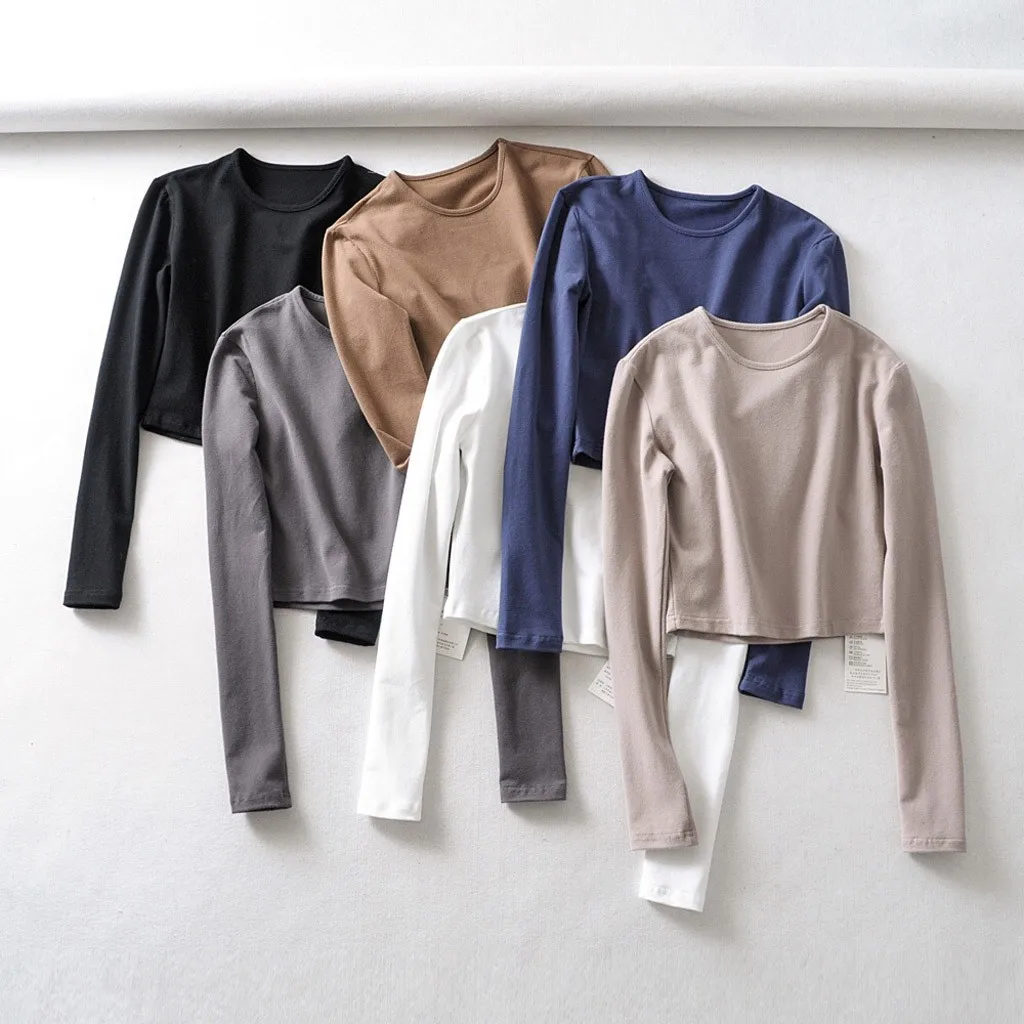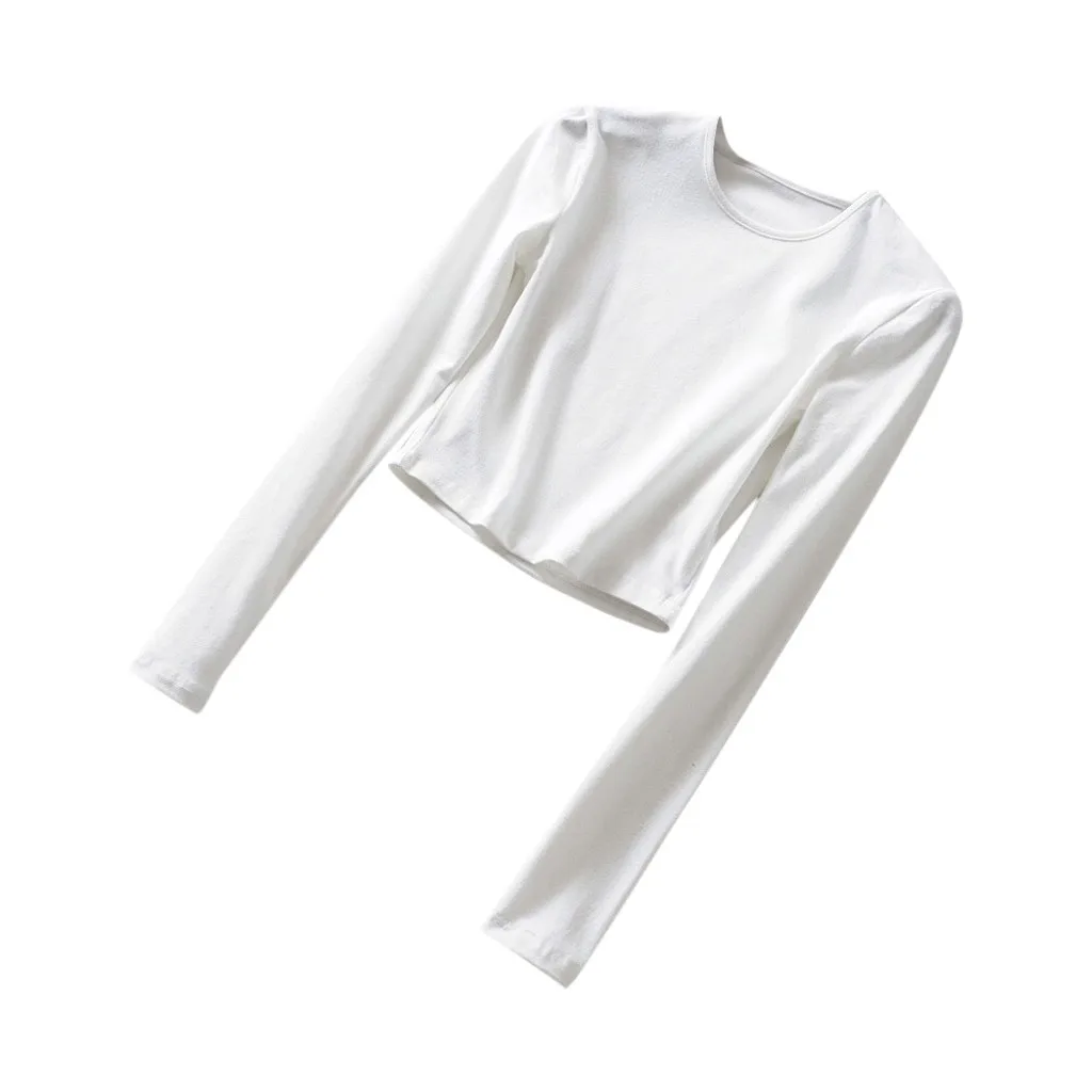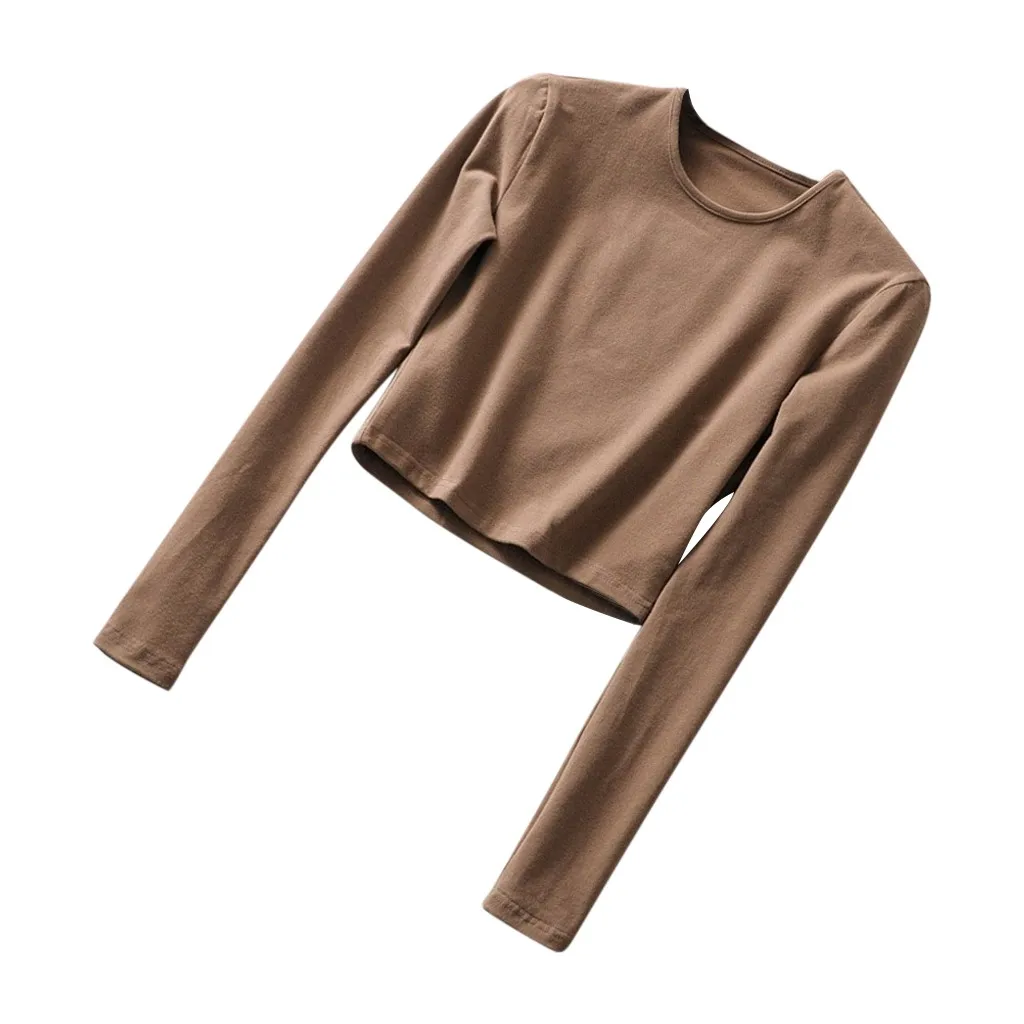 Женская футболка с круглым вырезом, теплая однотонная облегающая футболка с эластичным верхом на спине, укороченный топ с длинными рукавами, Повседневная Спортивная одежда на осень и зиму