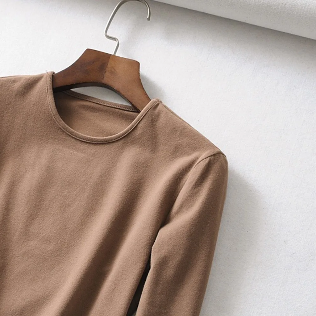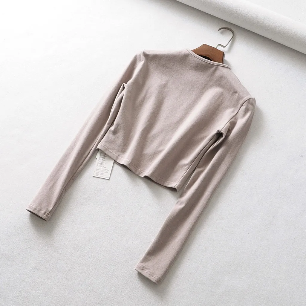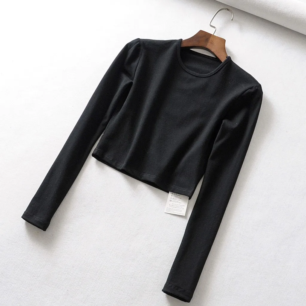 Женская футболка с круглым вырезом, теплая однотонная облегающая футболка с эластичным верхом на спине, укороченный топ с длинными рукавами, Повседневная Спортивная одежда на осень и зиму
