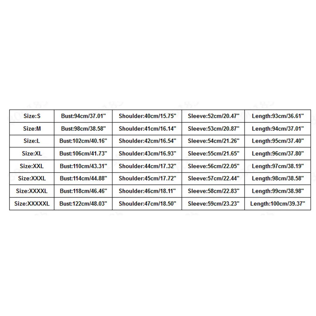 | Size:XXXXXL | Bust:122cm/48.03'' | Shoulder:47cm/18.50'' | Sleeve:59cm/23.23'' | Length:100cm/39.37'' |