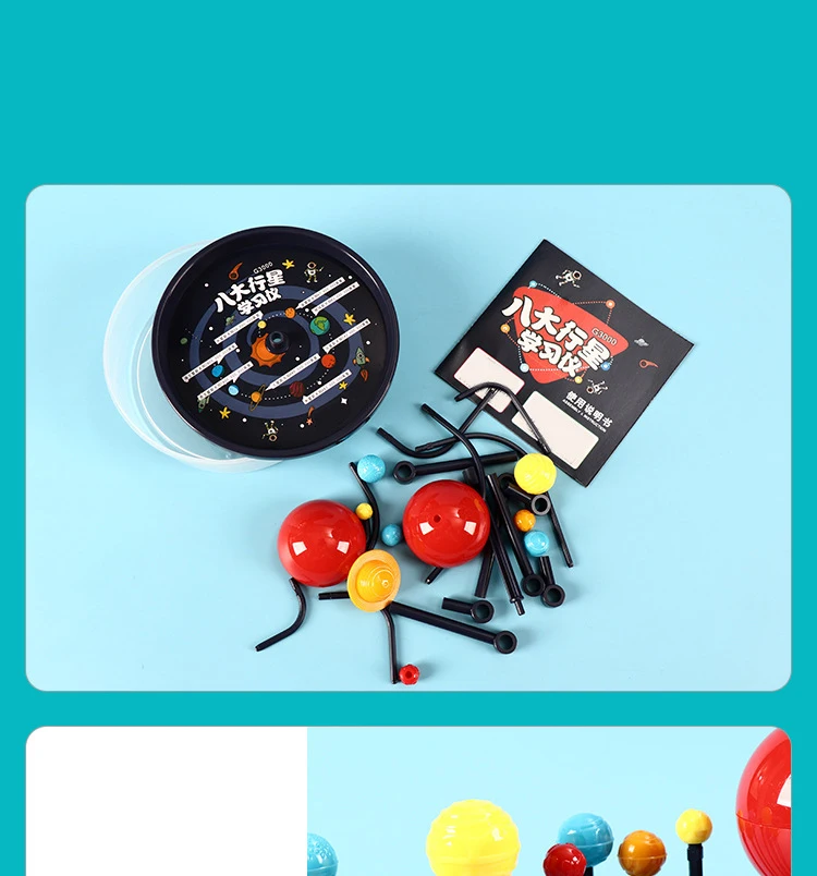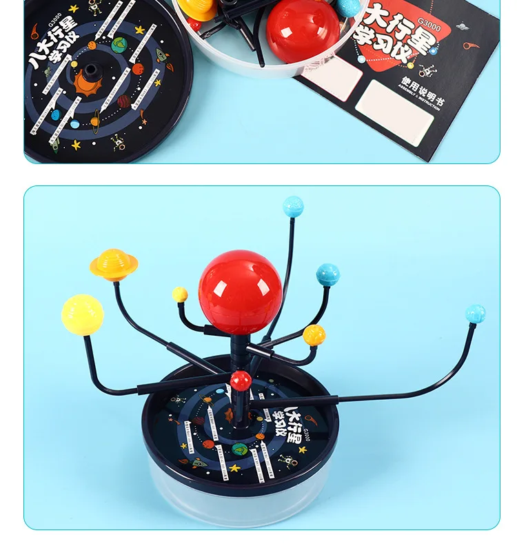 Contains model pieces for the sun and 8 planets, movable arms and stand