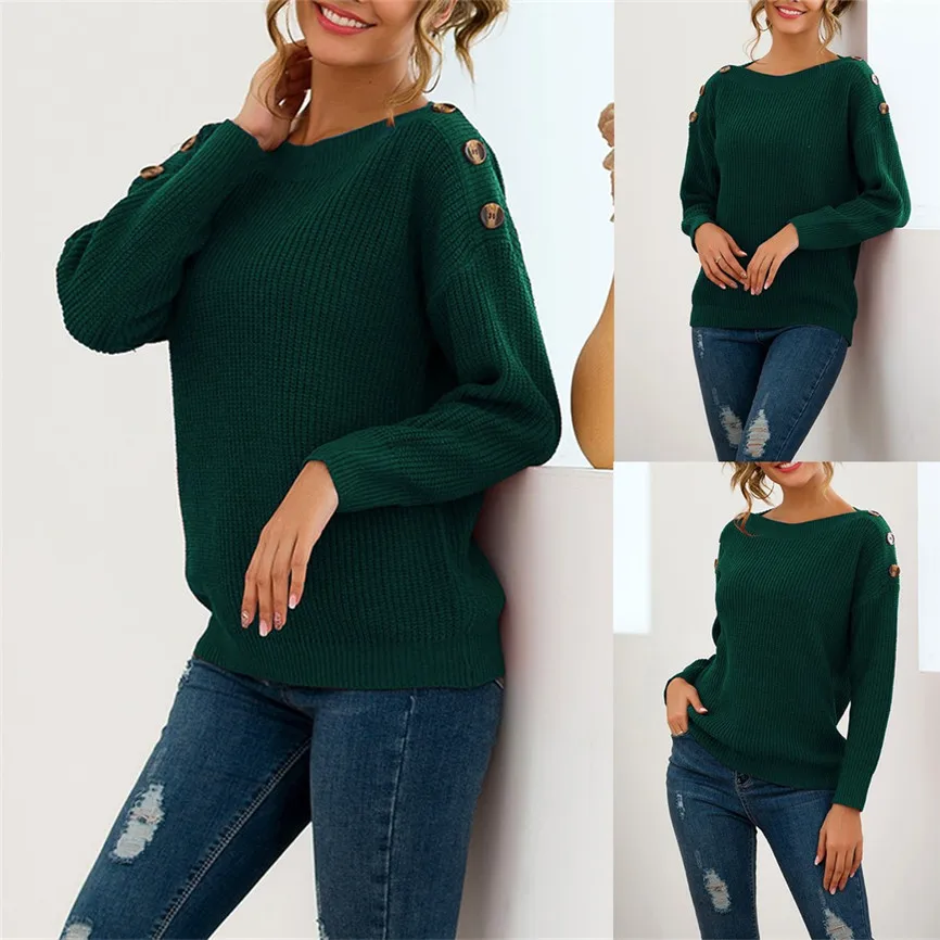 Пуловер размера плюс Женский вязаный Однотонный свитер с длинным рукавом и круглым вырезом