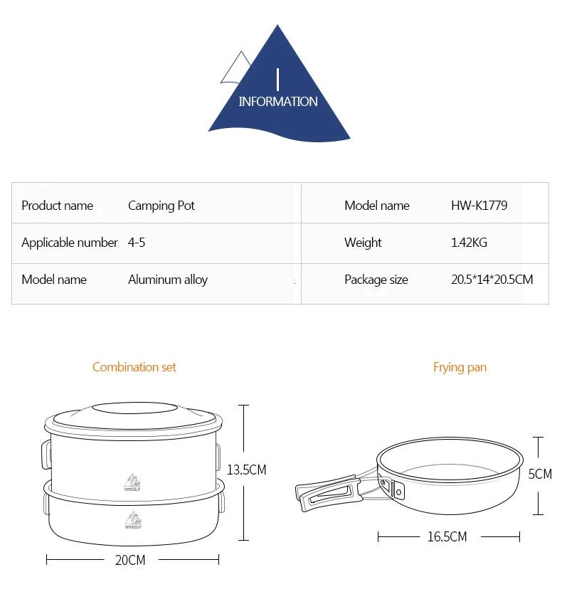 Описание товара:Тип: уличная посуда для 4-5 человекМатериал: качественный алюминийПодходит для: кемпинга, самостоятельного вождения, рыбалки, езды на велосипеде, путешествийВес: 1,42 кг Посылка:1 * чайник1 * сковорода1 * большой горшок1 * Средний горшок1 * рисовая ложка1 * ложка для супа2 * блюдо4 * пластиковая чаша1 * чистящий шар