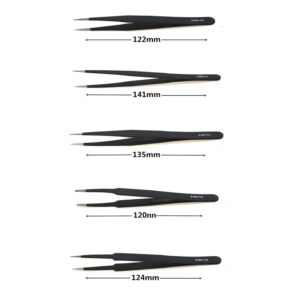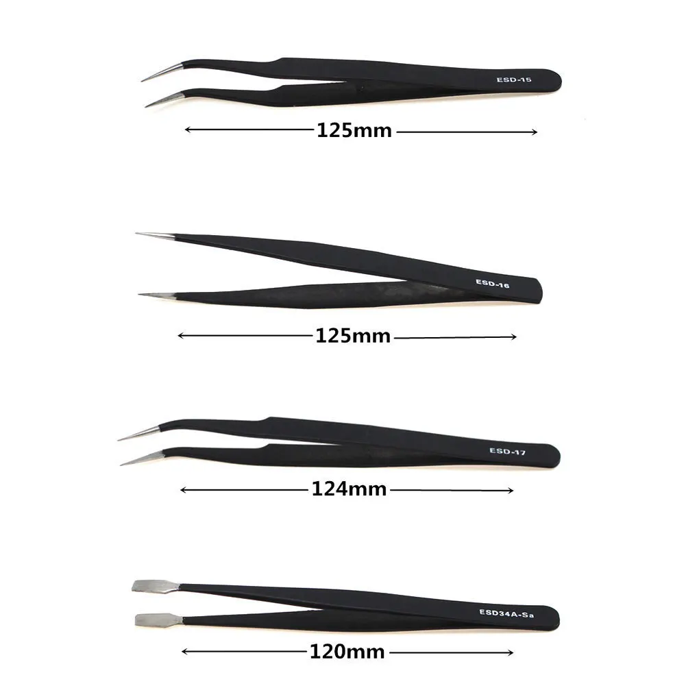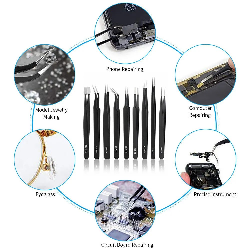 Профессиональный пинцет ESD комплект обеспечит инструменты, которые вам нужны для вас. Применяется для ремонта прецизионных устройств, печатных плат, цифровых продуктов, выбора мелких предметов и т. д. Отлично подходит для электроники, ювелирных изделий и других ювелирных изделий, медицинских и лабораторных работ, косметического удаления волос и многого другого.