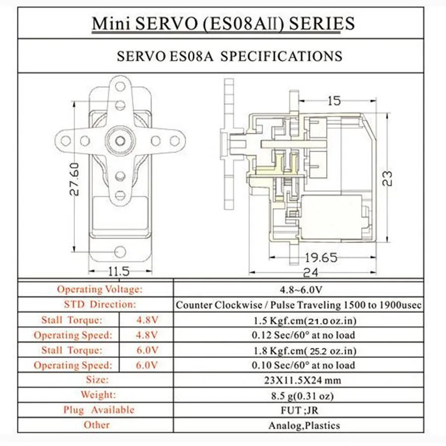 ES08D II: Цифровой сервопривод EMAX ES08D II легкий и идеально подходит для радиоуправляемого самолета. С большим крутящим моментом и большой скоростью, ES08D II-это идеальный бюджетный Повседневный сервопривод. Поставляется с монтажным оборудованием и дополнительными сервоприводами. Особенности:* Изготовлен из специальной инженерной пластмассы, комплект передач и Чехол очень жесткие.* Благородный потенциометр, обеспечивающий высокую точность и слаженность.* Конструкция с двумя подшипниками поддерживает низкую обратную реакцию и гладкость сервопривода в течение длительного времени.* 8,6g легкий дизайн, идеальный выбор для RC heli airplane.* Простота установки.* 100% новый бренд. Характеристики:Бренд: EMAXНазвание: ES08D II ServoВес: 8,6 гСигнал: ЦифровойНапряжение: 4,8 ~ 6VСкорость @ 4,8 v: 0,12 сек @ 60 град.Скорость при 6 в: 0,10 сек @ 60 град.Высокий крутящий момент @ 4,8 v: 1,6 kg. СмВысокий крутящий момент @ 6В: 2,0 kg. СмРазмеры: 24*23*11,5 ммВ наличии Разъем: FUT;JR Информация о посылка:Посылка Размер: 4,5*4*3 см/1,8*1,6 * 1.2inПосылка масса: 17 г/0,6 унцииКартонная коробка Посылка включает в себя:1 * EMAX ES08D II ПЛАСТИКОВЫЙ цифровой сервопривод1 * серво рога и комплект фитинга