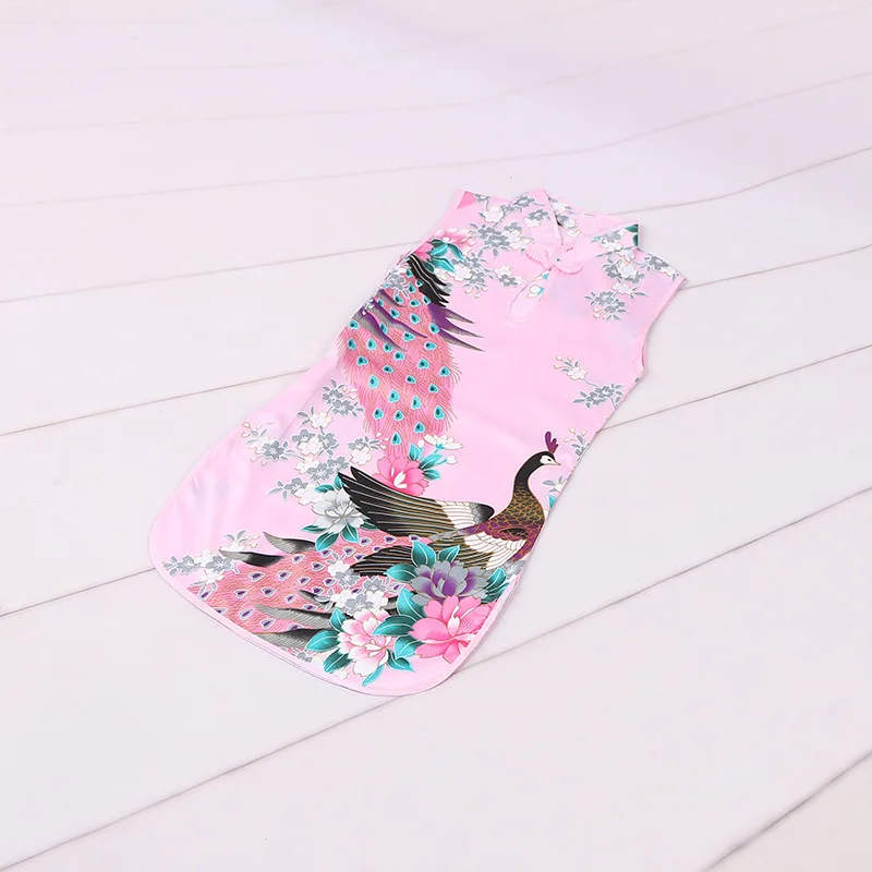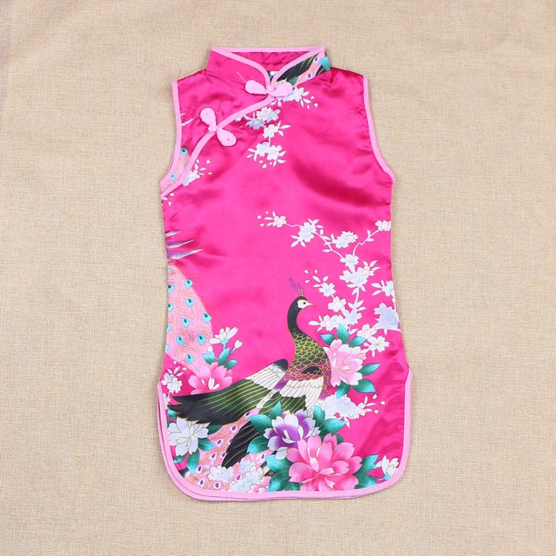 100% новый и высокое качество Уникальный дизайн выреза очень элегантен. Китайское платье чонсам (ципао), сочетание классики и моды Идеально подходит для вашей маленькой принцессы Материал: смесь шелка Цвета: белый, красный, розовый, розовый, синий Узор: Цветочный павлин Стиль: китайское платье Ципао