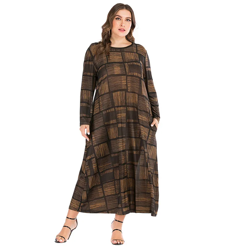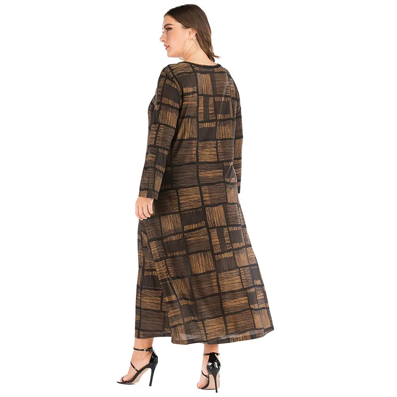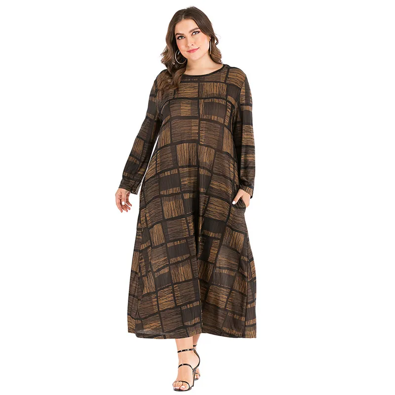 Женское свободное платье большого размера d, летнее винтажное платье в клетку с круглым вырезом и длинным рукавом, длинные платья макси размера плюс 6XL