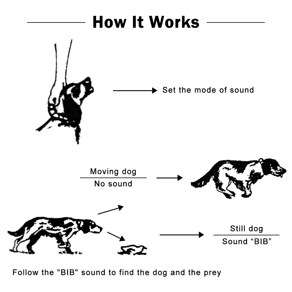 Установите различные «Биб» для 3 собак в то же время, когда собака двигается быстро, звуковой сигнал издает короткий «Биб» звук; Когда собака двигается медленно или не двигается, что означаетСобака может быть обнаружена в добычи, тогда звуковой сигнал будет издавать срочные и непрерывные «Биб», так что вы можете следить за звуком, чтобы получить его. Вы можете использовать пульт дистанционного управления, чтобы поставить на паузу или воспроизвести звук «bib» в пределах 1000 метров, это действительно хороший помощник, чтобы найти собак и найти добычу.