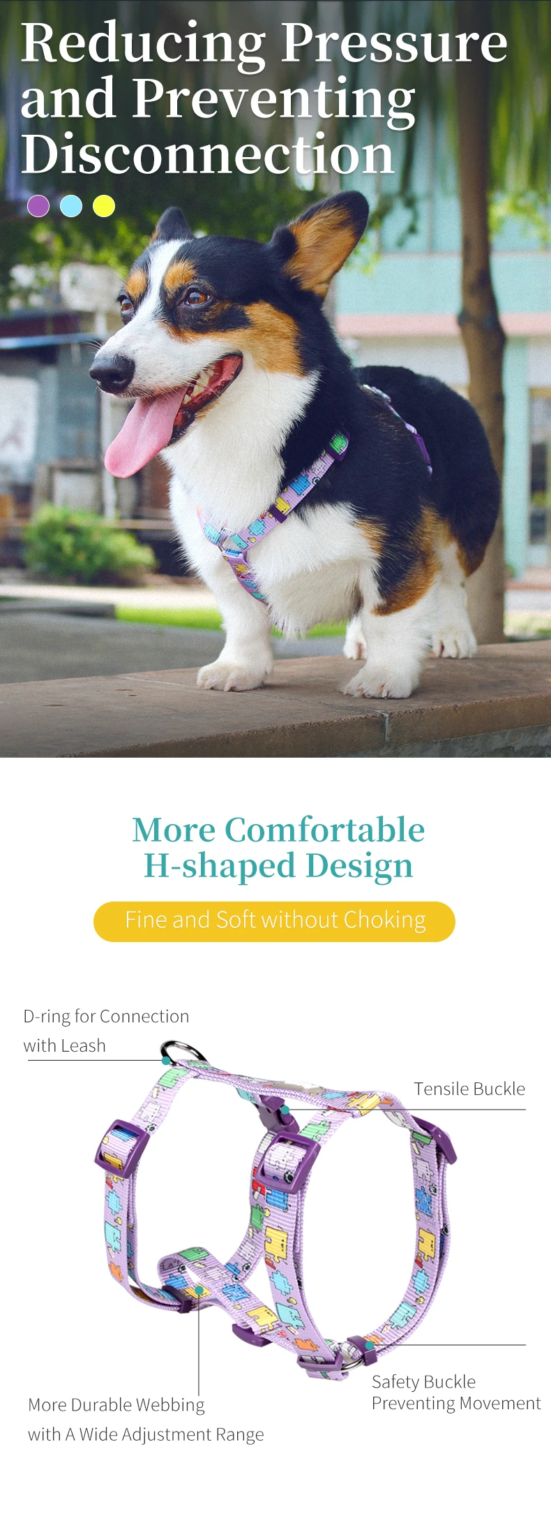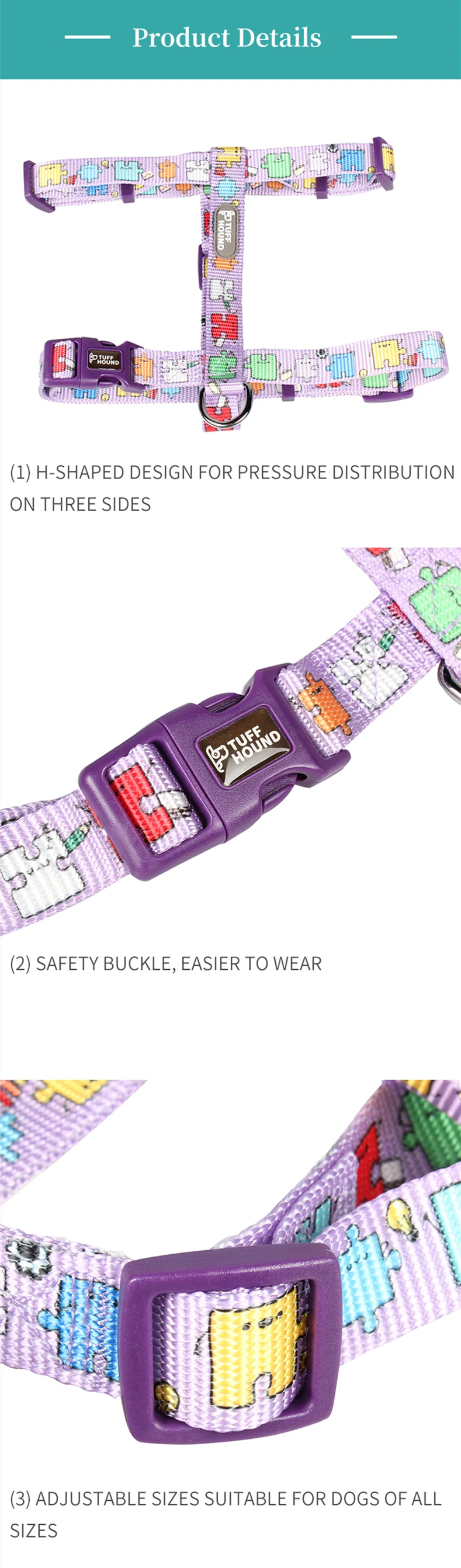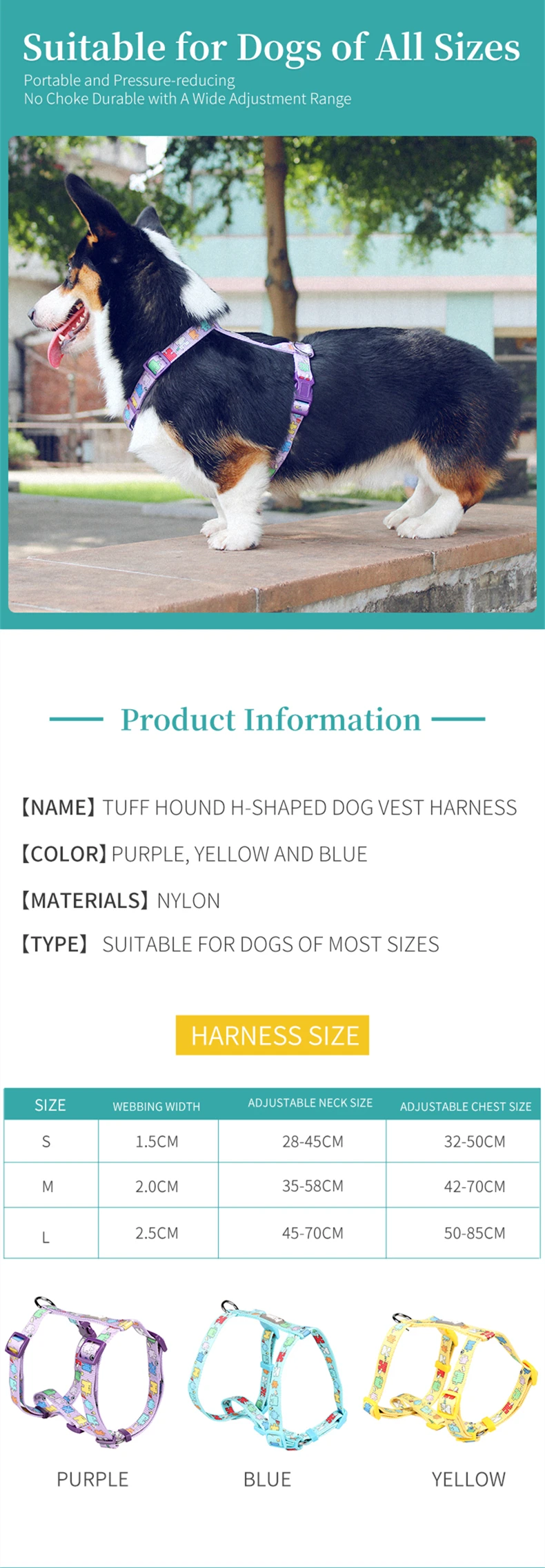Material: Nylon made in China Product Category: Chest strap Item: 1634 Chest and back Scalability: No Brand: tuffhound Color: blue, purple, yellow, Note: This product is single strap without traction rope Specification (length * width) S: 1.5 * (28-45) * (32-50) cm, M: 2.0 * (35-58) * (42-70) cm, L: 2.5 * (45-70) * (50-85) cm