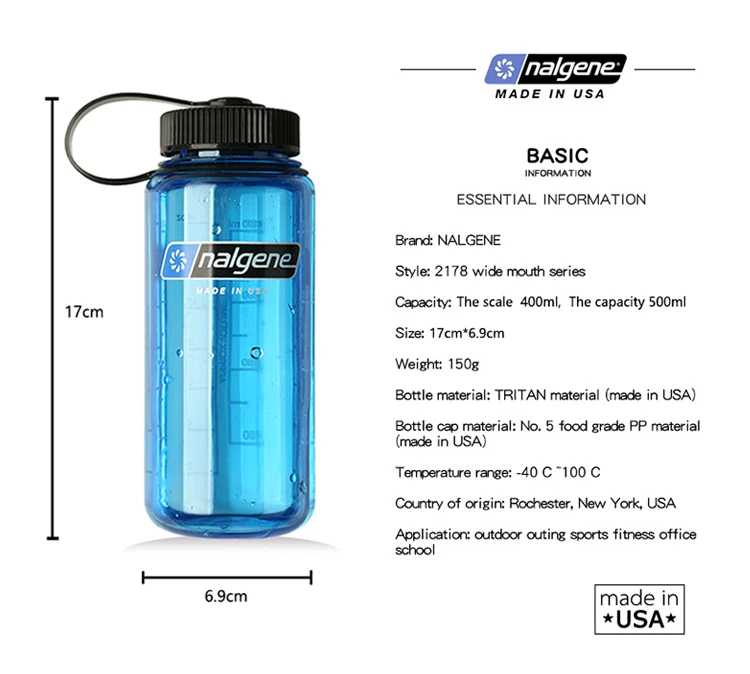 Бренд: NALGENE Емкость: масштаб 400 мл, полная бутылка 500 мл Размер: 17*6,9 см Вес: 150 г Материал бутылки: Тритан (Сделано в США) Материал крышки бутылки: №5 пищевой полипропиленовый материал (Сделано в США) Диапазон температур: -40 ℃ ~ 100 ℃ Страна происхождения: Рочестер, Нью-Йорк, США Применение: прогулки на открытом воздухе, спортивный фитнес, Офисная школа