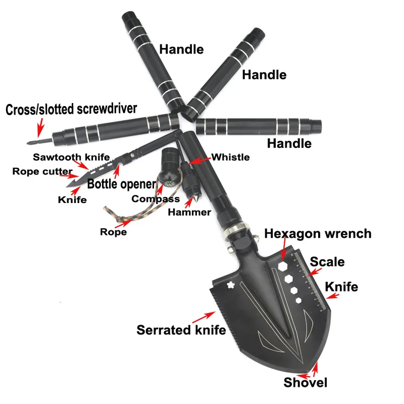Модель: GSHVL-001 Длина: 125,5 см/107 см Размер лопаты: 19x15 см (толщина: 2,5 мм) Вес: 1,7 кг/1,54 кг Материал: 440C + алюминиевый сплав Посылка: походная Лопата + камуфляжная сумка