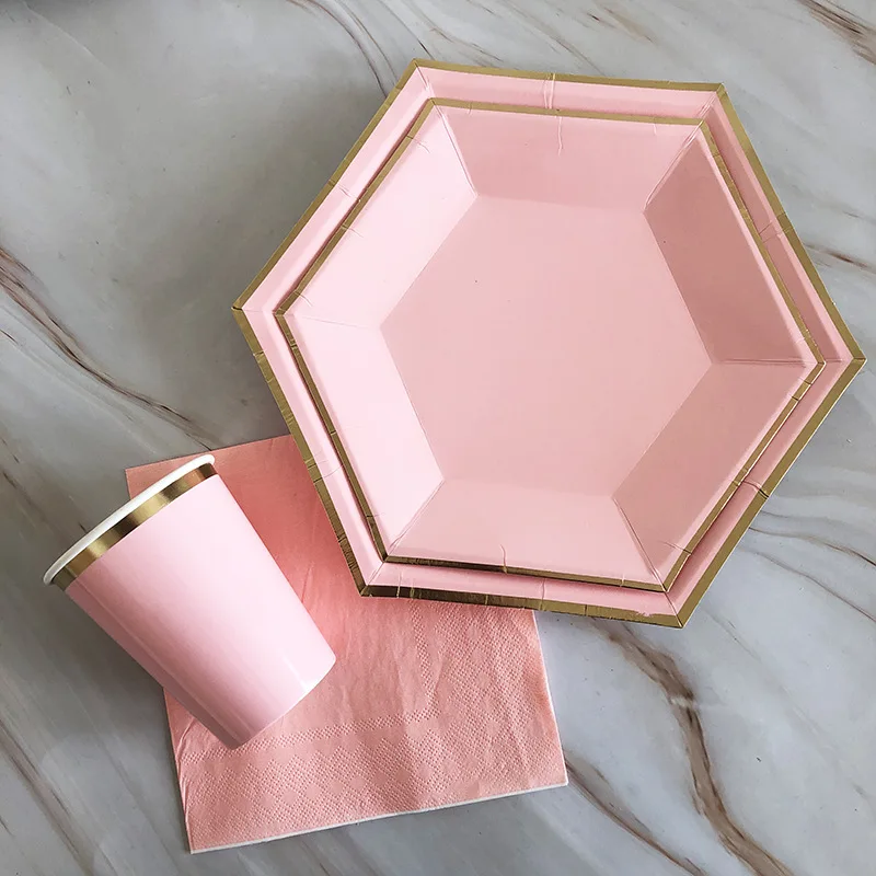 Позолоченная одноразовая посуда, милые детские розовые бумажные тарелки и стаканы на день рождения, салфетки для детского душа, принадлежности для украшения свадебной вечеринки