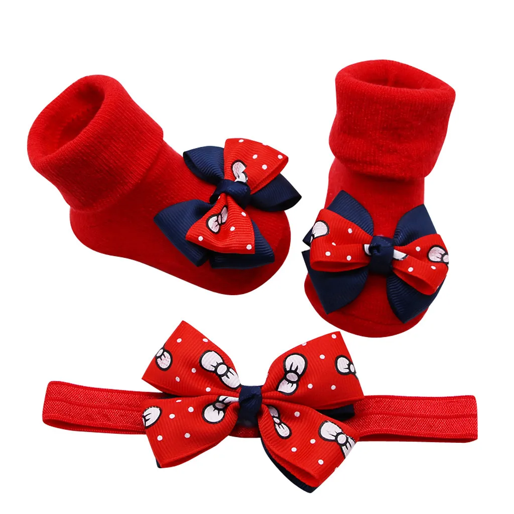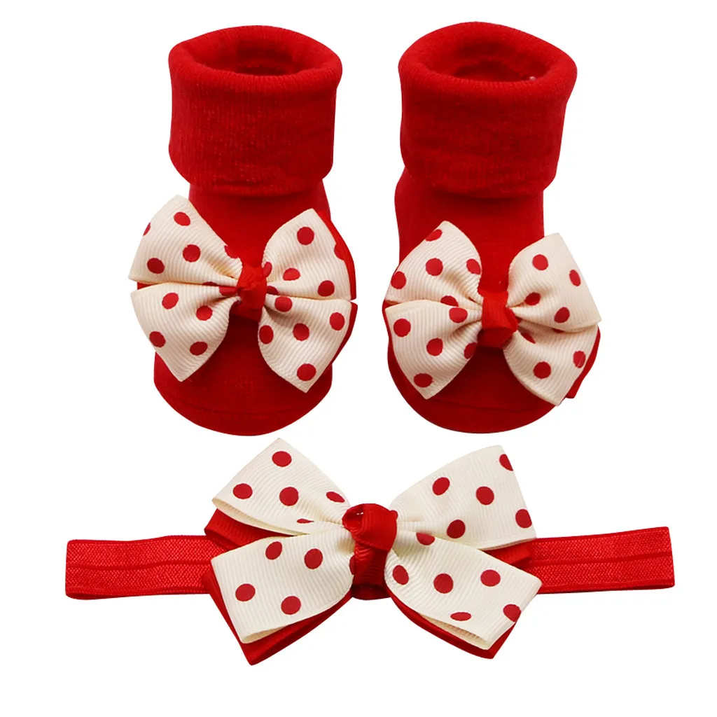 Носки для малышей + 1 шт., пояс для волос, нескользящие носки с бантом и оборками для маленьких девочек осенне-зимняя одежда для новорожденных, аксессуары