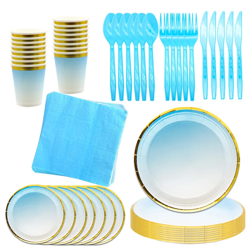 Золотая фольга, одноразовая посуда, голубой градиентный цвет, бумажный стаканчик, тарелка, декор для свадебной вечеринки, детский душ, детские товары для вечеринки на день рождения