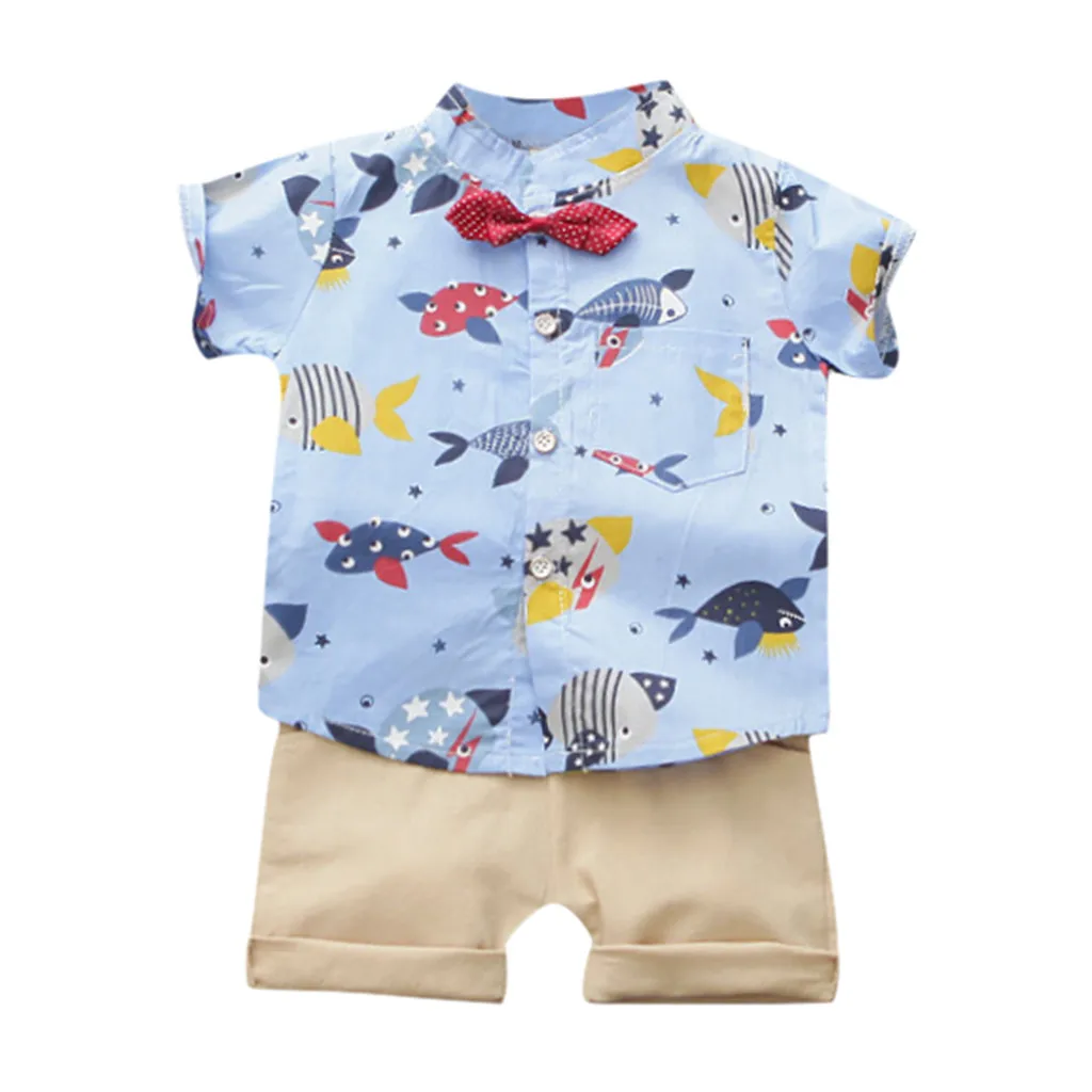 Новый брендовый Костюм Джентльмена для маленьких мальчиков и девочек Рубашка с галстуком-бабочкой и короткими рукавами для малышей Топы с изображением морской рыбы + шорты, летний комплект детской одежды