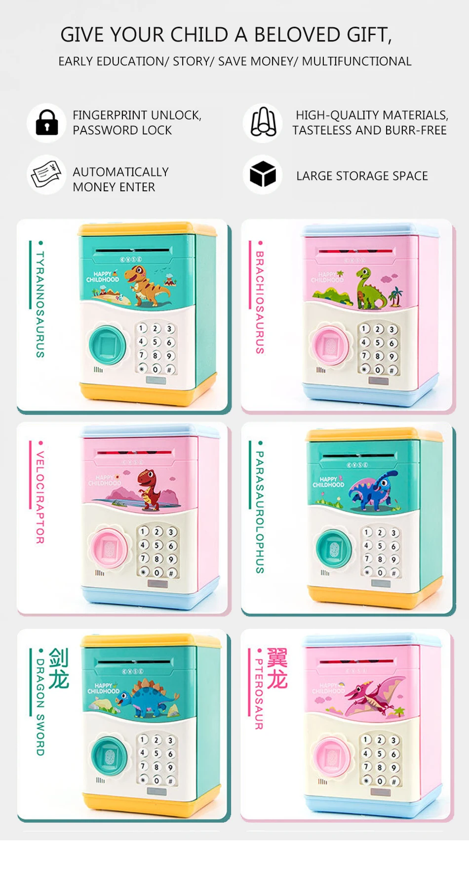 Age Range8~13 YearsAge Range2-4 YearsAge Range5-7 YearsBrand NameLittle JModel NumberWJ3747#A23-0119WarningKeep Far Away From FireThemeAnimals & NatureThemeMusicMeasurement unitpiece/piecesEach pack1Capacity500 Notes/700 CoinsBattery3 x 5A Batteries ( Not Included)Cash box savingTreasure boxMaterialABS Plastic+Electronic ComponentsPatternDinosaur
