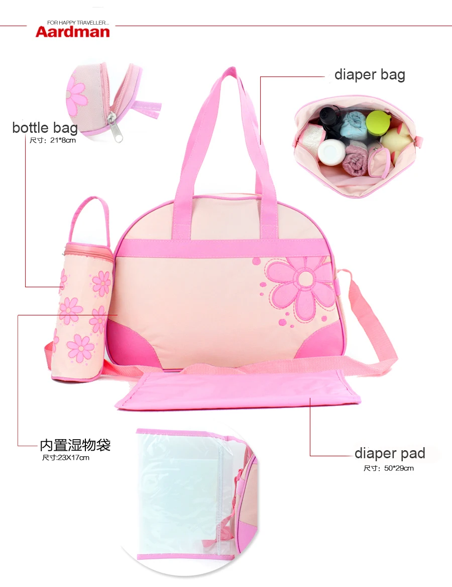 100% Brand New Material: Polyester(outside)+ Waterproof PVC(Inner) Size: Big Bag: 50*29CM Diaper pad: 47*26 CM Feeding bottle holder:21*8CM Package: 1 x big bag 1 x diaper pad 1 x feeding bottle holder