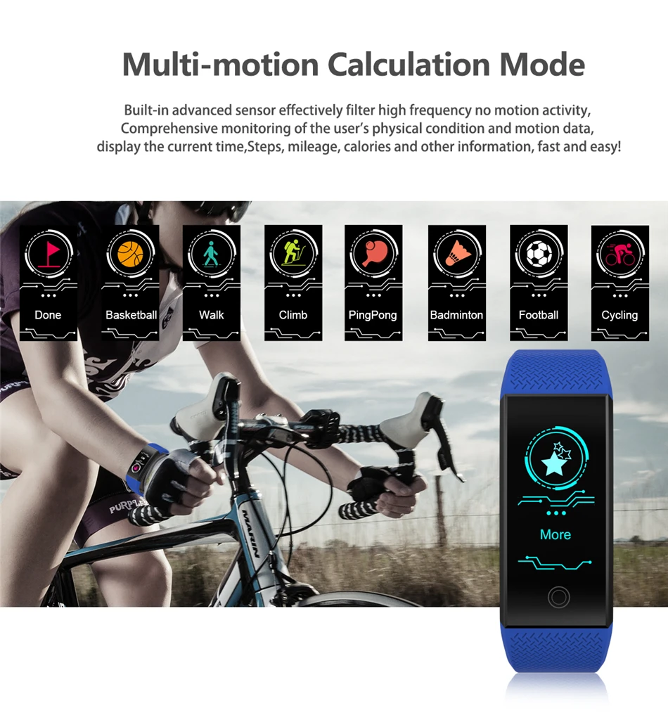 ● Мульти-спортивные режимы: 7 режимов упражнений помогут вам лучше понять конкретные данные о деятельности. Спортивные режимы, включая баскетбол, Пешие прогулки, скалолазание, пинг-понг, бадминтон, режимы футбола и велоспорта, просты в использовании и переключаются, и данные моментально отображаются на экране.