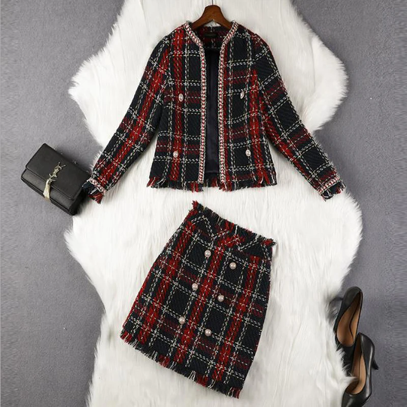 Женский твидовый костюм в клетку, облегающий офисный комплект из двух предметов с мини юбкой, одежда на осень и зиму 2019, размера плюс