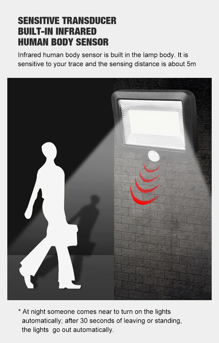 Мощность: 30 Вт Материал: АБС-пластик Светильник Кол-во в коробке: 100LED Функция: индукция человеческого тела Световой поток ламп: 600 лм Индукционное расстояние: 5-8 м/16,4-26,2 ФТ Способ установки: подвесная стена с отверстиями Солнечные панели: высококачественный поликремний, 5,5 В 1 Вт Батарея: 3,7 V 1200mAh литиевая батарея, перезаряжаемая Время работы: Зарядка 6 часов в течение дня и работа более 10 часов в ночное время